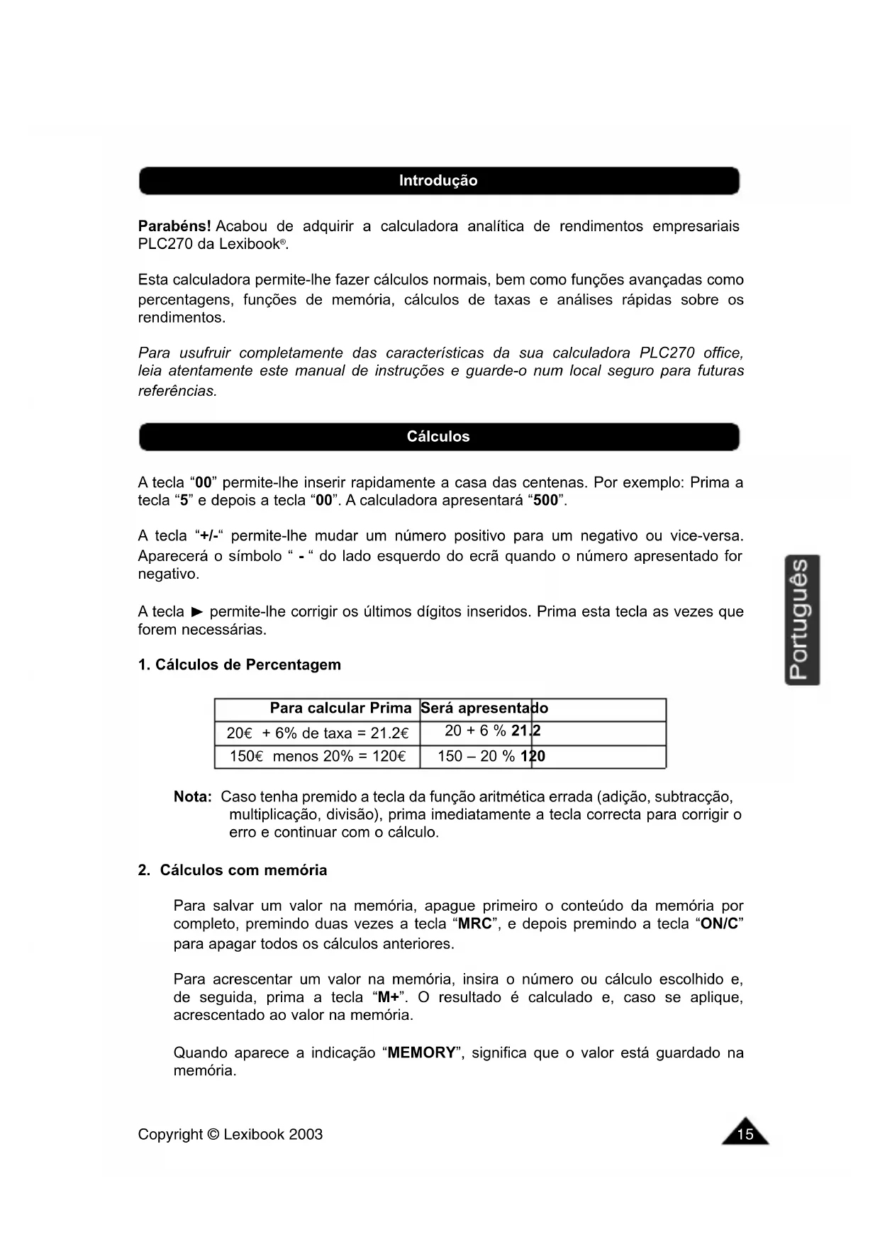 Para salvar um valor na memória, apague primeiro o conteúdo da memória por completo, premindo duas vezes a tecla “MRC”, e depois premindo a tecla “ON/C” para apagar todos os cálculos anteriores. Para acrescentar um valor na memória, insira o número ou cálculo escolhido e, de seguida, prima a tecla “M+”. O resultado é calculado e, caso se aplique, acrescentado ao valor na memória. Quando aparece a indicação “MEMORY”, significa que o valor está guardado na memória. Para calcular Prima Será apresentado 20€ + 6% de taxa = 21.2€ 20 + 6 % 21.2 150€ menos 20% = 120€ 150 – 20 % 120 Cálculos IntroduçãoCopyright © Lexibook 2003