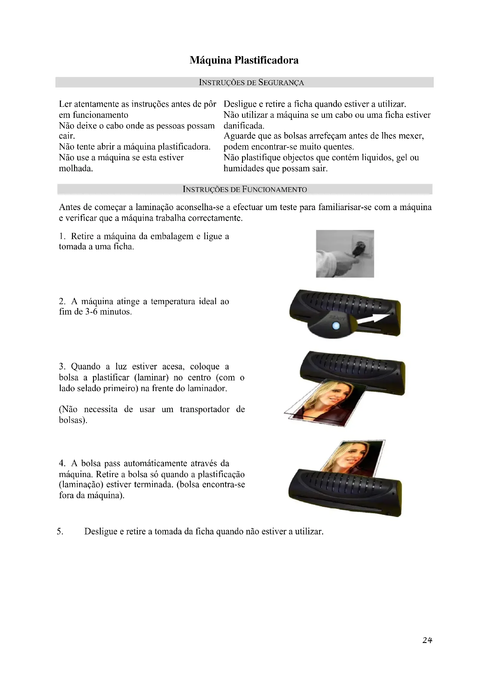 Recomendamos que efectue um teste especialmente antes de plastificar (laminar) fotografias importantes ou documents ou quando mudar de marca de bolsas (A qualidade das bolsas pode variar de marca para marca).