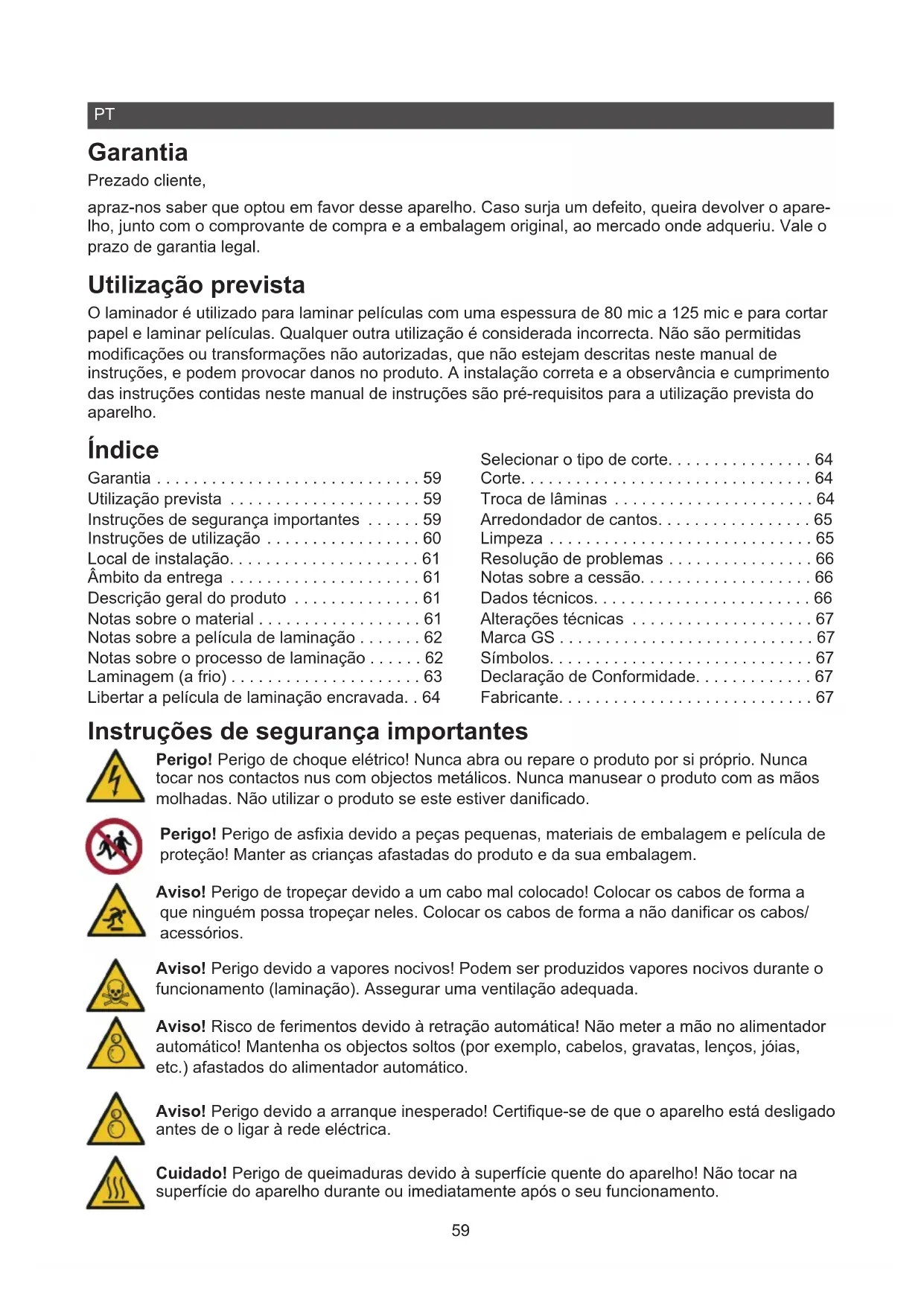 - Garantia Prezado cliente, apraz-nos saber que optou em favor desse aparelho. Caso surja um defeito, queira devolver o apare- lho, junto com o comprovante de compra e a embalagem original, ao mercado onde adqueriu. Vale o prazo de garantia legal. Utilização prevista O laminador é utilizado para laminar películas com uma espessura de 80 mic a 125 mic e para cortar papel e laminar películas. Qualquer outra utilização é considerada incorrecta. Não são permitidas modicações ou transformações não autorizadas, que não estejam descritas neste manual de instruções, e podem provocar danos no produto. A instalação correta e a observância e cumprimento das instruções contidas neste manual de instruções são pré-requisitos para a utilização prevista do aparelho. Índice Garantia p. 59