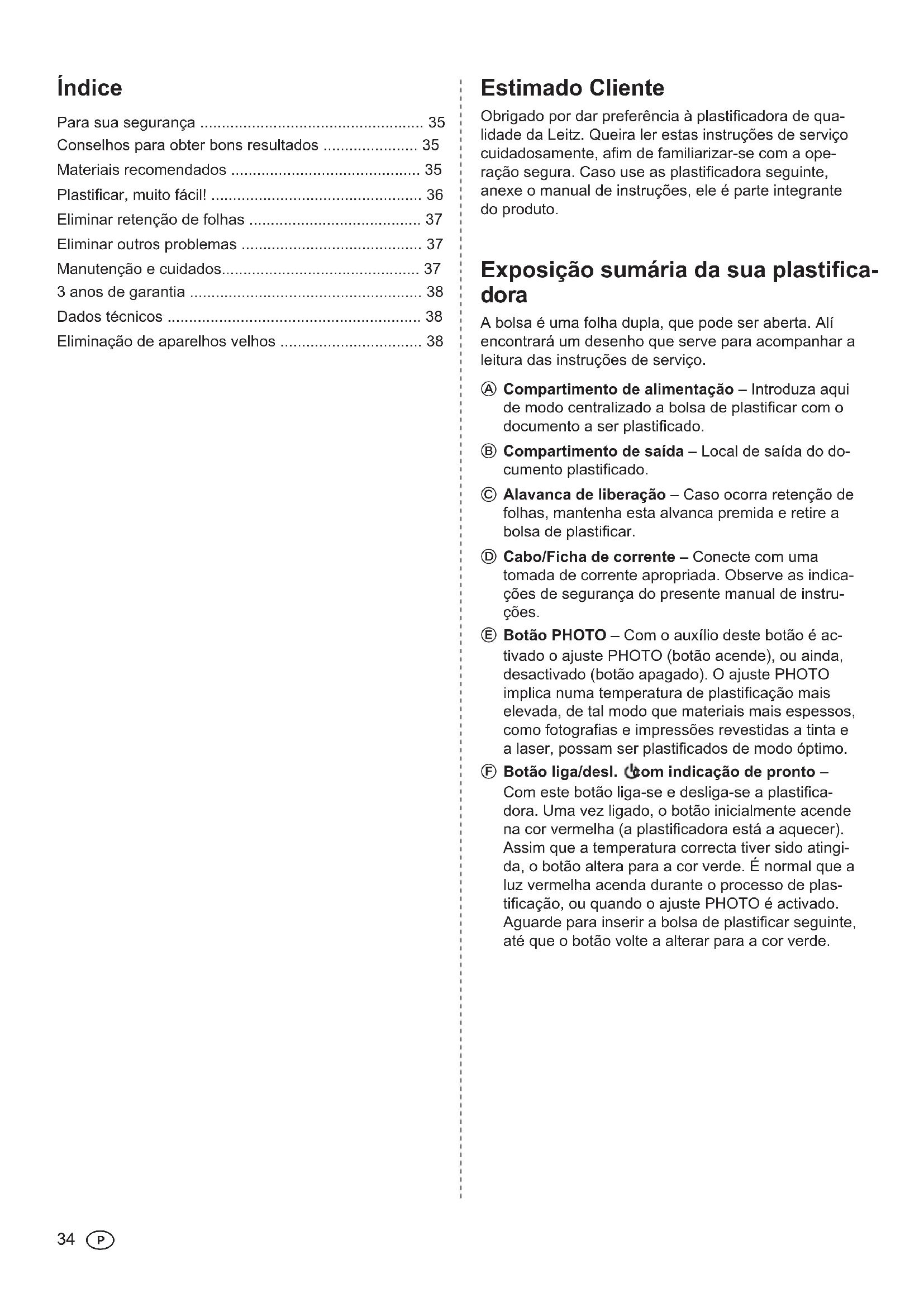- Eliminação de aparelhos velhos Estimado Cliente Obrigado por dar preferência à plasticadora de qua- lidade da Leitz. Queira ler estas instruções de serviço cuidadosamente, am de familiarizar-se com a ope- ração segura. Caso use as plasticadora seguinte, anexe o manual de instruções, ele é parte integrante do produto.P p. 38