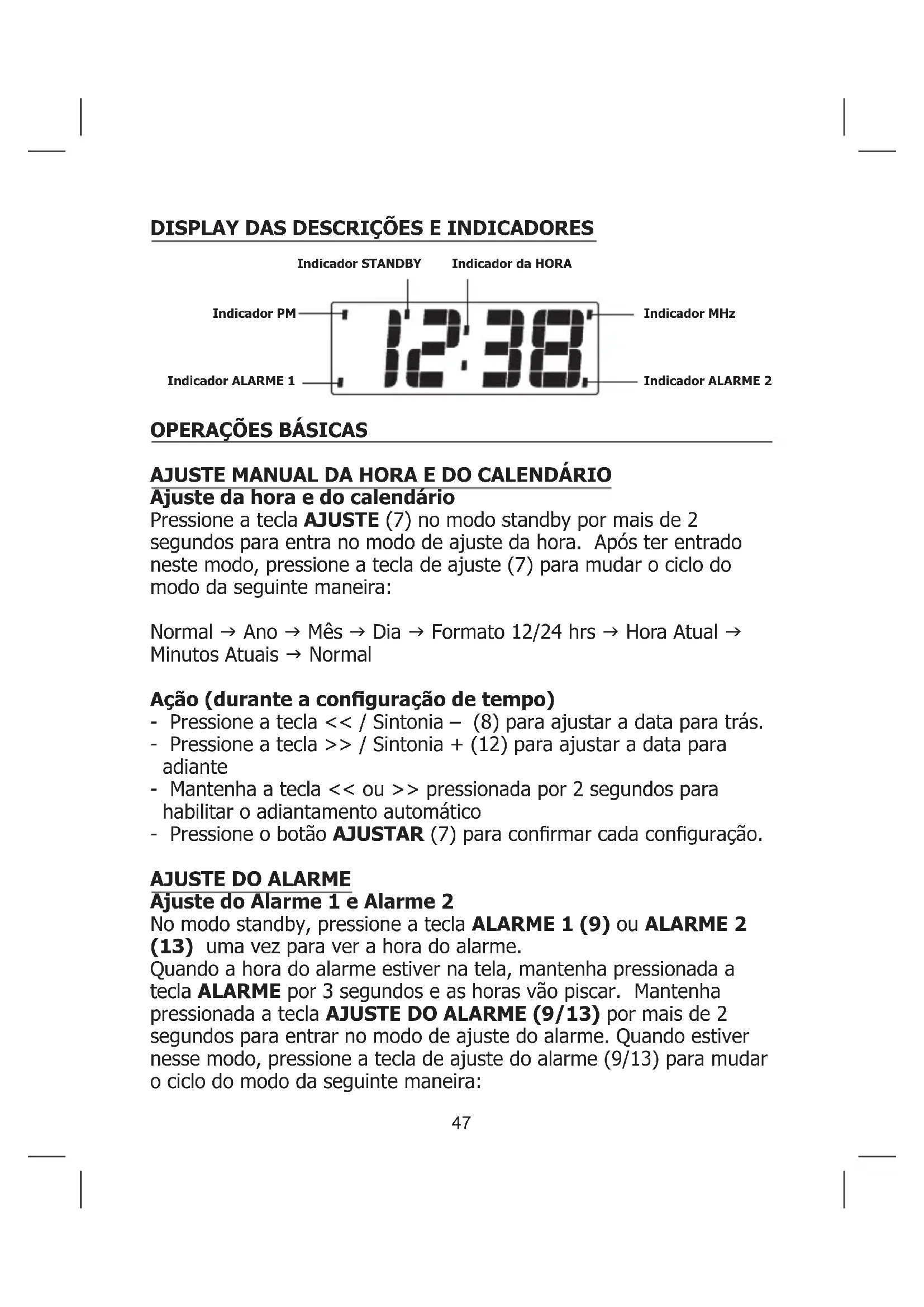 AJUSTE MANUAL DA HORA E DO CALENDÁRIO Ajuste da hora e do calendário Pressione a tecla AJUSTE (7) no modo standby por mais de 2 segundos para entra no modo de ajuste da hora. Após ter entrado neste modo, pressione a tecla de ajuste (7) para mudar o ciclo do modo da seguinte maneira: Normal g Ano g Mês g Dia g Formato 12/24 hrs g Hora Atual g Minutos Atuais g Normal Ação (durante a conguração de tempo) - Pressione a tecla << / Sintonia – (8) para ajustar a data para trás. - Pressione a tecla >> / Sintonia + (12) para ajustar a data para adiante - Mantenha a tecla << ou >> pressionada por 2 segundos para habilitar o adiantamento automático - Pressione o botão AJUSTAR (7) para conrmar cada conguração.