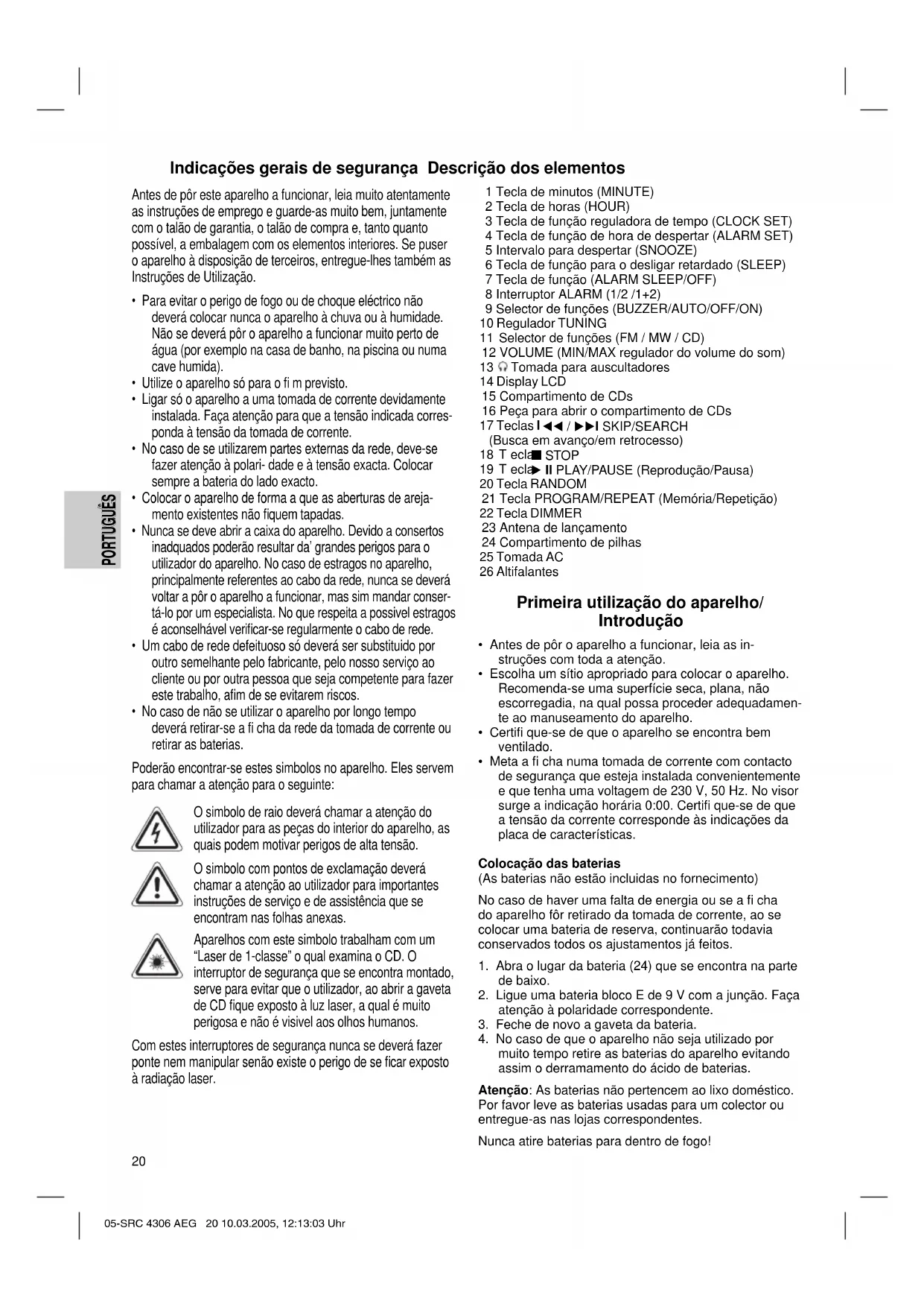 muito tempo retire as baterias do aparelho evitando assim o derramamento do ácido de baterias. Atenção: As baterias não pertencem ao lixo doméstico. Por favor leve as baterias usadas para um colector ou entregue-as nas lojas correspondentes. Nunca atire baterias para dentro de fogo! 05-SRC 4306 AEG 20 10.03.2005, 12:13:03 Uhr Antes de pôr este aparelho a funcionar, leia muito atentamente as instruções de emprego e guarde-as muito bem, juntamente com o talão de garantia, o talão de compra e, tanto quanto possível, a embalagem com os elementos interiores. Se puser o aparelho à disposição de terceiros, entregue-lhes também as Instruções de Utilização.