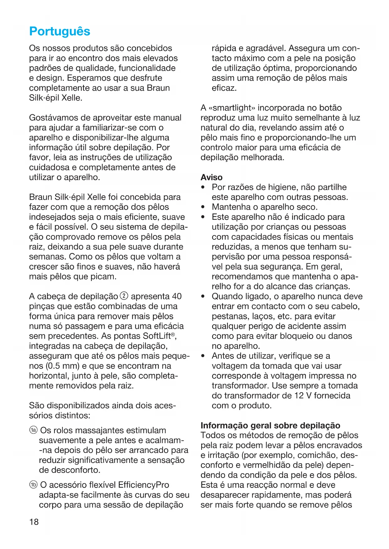 O acessório flexível EfficiencyPro adapta-se facilmente às curvas do seu corpo para uma sessão de depilação rápida e agradável. Assegura um con- tacto máximo com a pele na posição de utilização óptima, proporcionando assim uma remoção de pêlos mais eficaz. A «smartlight» incorporada no botão reproduz uma luz muito semelhante à luz natural do dia, revelando assim até o pêlo mais fino e proporcionando-lhe um controlo maior para uma eficácia de depilação melhorada. Aviso Por razões de higiene, não partilhe este aparelho com outras pessoas. Mantenha o aparelho seco. Este aparelho não é indicado para utilização por crianças ou pessoas com capacidades físicas ou mentais reduzidas, a menos que tenham su- pervisão por uma pessoa responsá- vel pela sua segurança. Em geral, recomendamos que mantenha o apa- relho for a do alcance das crianças. Quando ligado, o aparelho nunca deve entrar em contacto com o seu cabelo, pestanas, laços, etc. para evitar qualquer perigo de acidente assim como para evitar bloqueio ou danos no aparelho. Antes de utilizar, verifique se a voltagem da tomada que vai usar corresponde à voltagem impressa no transformador. Use sempre a tomada do transformador de 12 V fornecida com o produto. Informação geral sobre depilação Todos os métodos de remoção de pêlos pela raiz podem levar a pêlos encravados e irritação (por exemplo, comichão, des- conforto e vermelhidão da pele) depen- dendo da condição da pele e dos pêlos. Esta é uma reacção normal e deve desaparecer rapidamente, mas poderá ser mais forte quando se remove pêlos