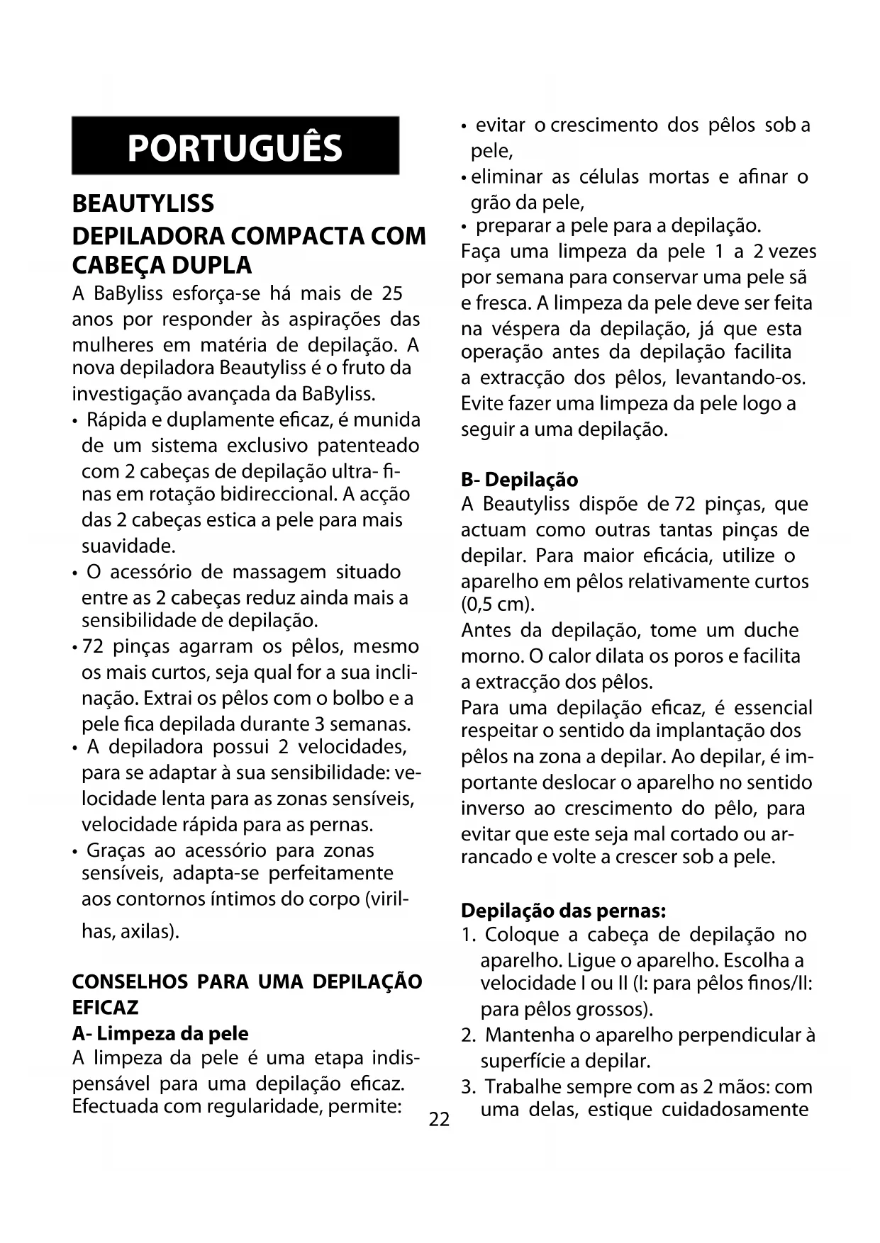 - preparar a pele para a depilação. Faça uma limpeza da pele 1 a 2 vezes por semana para conservar uma pele sã e fresca. A limpeza da pele deve ser feita na véspera da depilação, já que esta operação antes da depilação facilita a extracção dos pêlos, levantando-os. Evite fazer uma limpeza da pele logo a seguir a uma depilação. B- Depilação A Beautyliss dispõe de 72 pinças, que actuam como outras tantas pinças de depilar. Para maior ecácia, utilize o aparelho em pêlos relativamente curtos (0,5 cm). Antes da depilação, tome um duche morno. O calor dilata os poros e facilita a extracção dos pêlos. Para uma depilação ecaz, é essencial respeitar o sentido da implantação dos pêlos na zona a depilar. Ao depilar, é im- portante deslocar o aparelho no sentido inverso ao crescimento do pêlo, para evitar que este seja mal cortado ou ar- rancado e volte a crescer sob a pele. Depilação das pernas: