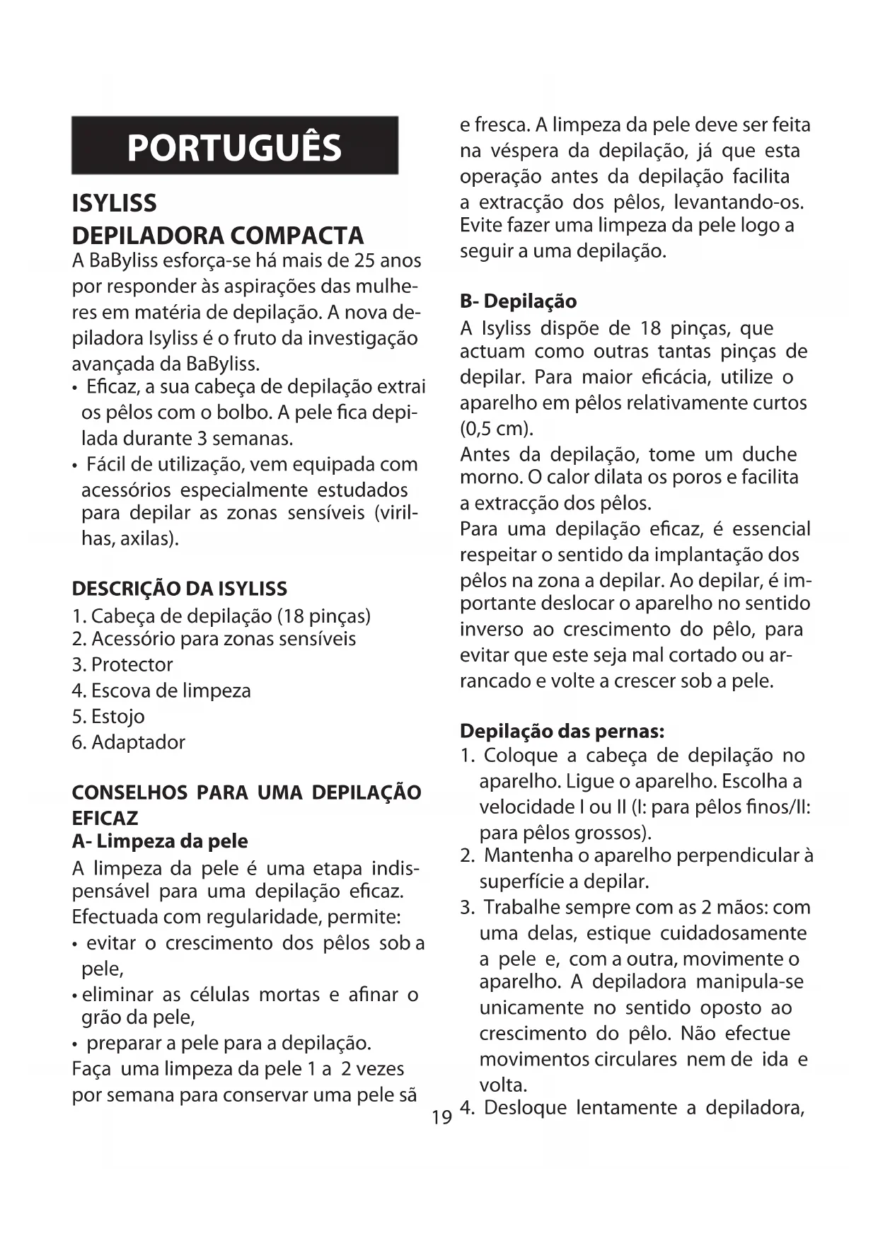 - Utilice los sistemas de recogida dispo- nibles en su país. De esta forma, algunos materiales po- drán recuperarse o reciclarse.19 PORTUGUÊS ISYLISS DEPILADORA COMPACTA A BaByliss esforça-se há mais de 25 anos por responder às aspirações das mulhe- res em matéria de depilação. A nova de- piladora Isyliss é o fruto da investigação avançada da BaByliss.