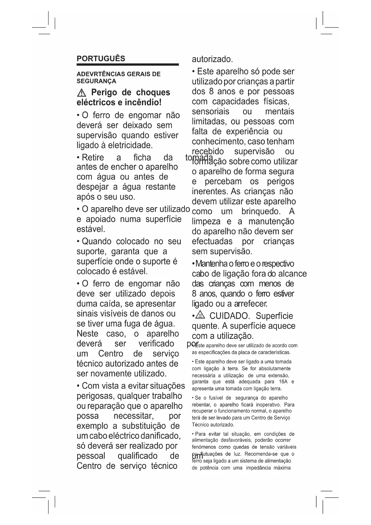- Mantenha o ferro e o respectivo cabo de ligação fora do alcance das crianças com menos de 8 anos, quando o ferro estiver ligado ou a arrefecer.