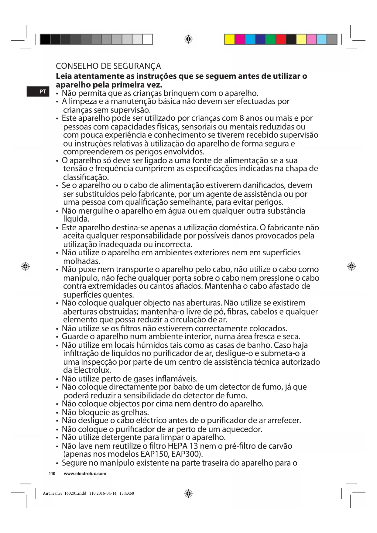 - Não utilize em locais húmidos tais como as casas de banho. Caso haja inltração de líquidos no puricador de ar, desligue-o e submeta-o a uma inspecção por parte de um centro de assistência técnica autorizado da Electrolux.