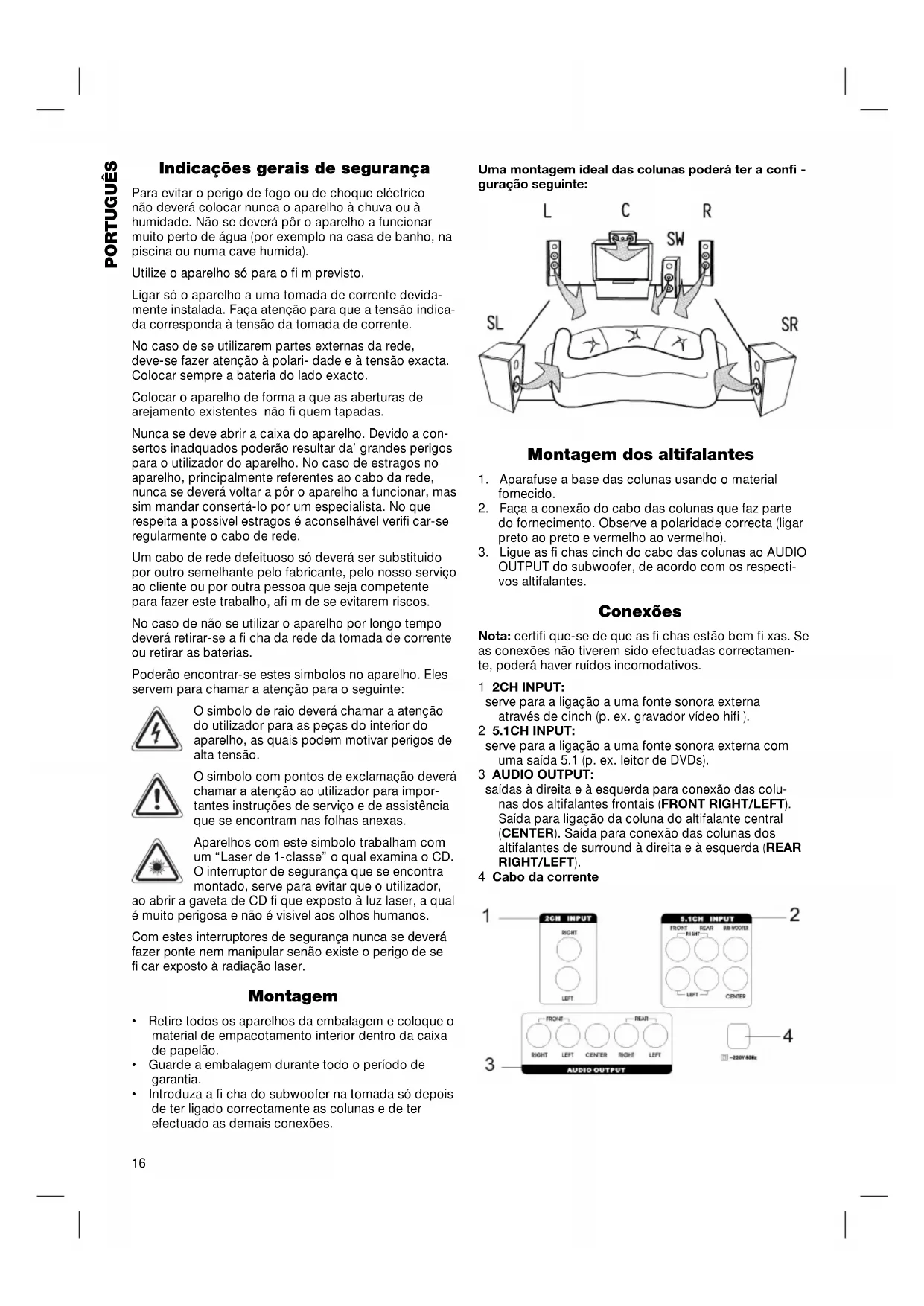 1 2CH INPUT RIGHT LEFT 5.1CH INPUT FRONT REAR 88-WOCER RIGHT LEFT CENTER 3 FRONT RIGHT LEFT CENTER RIGHT LEFT AUDIO OUTPUT -230V 60Hz 4A conexão correcta dos cabos é a seguinte: