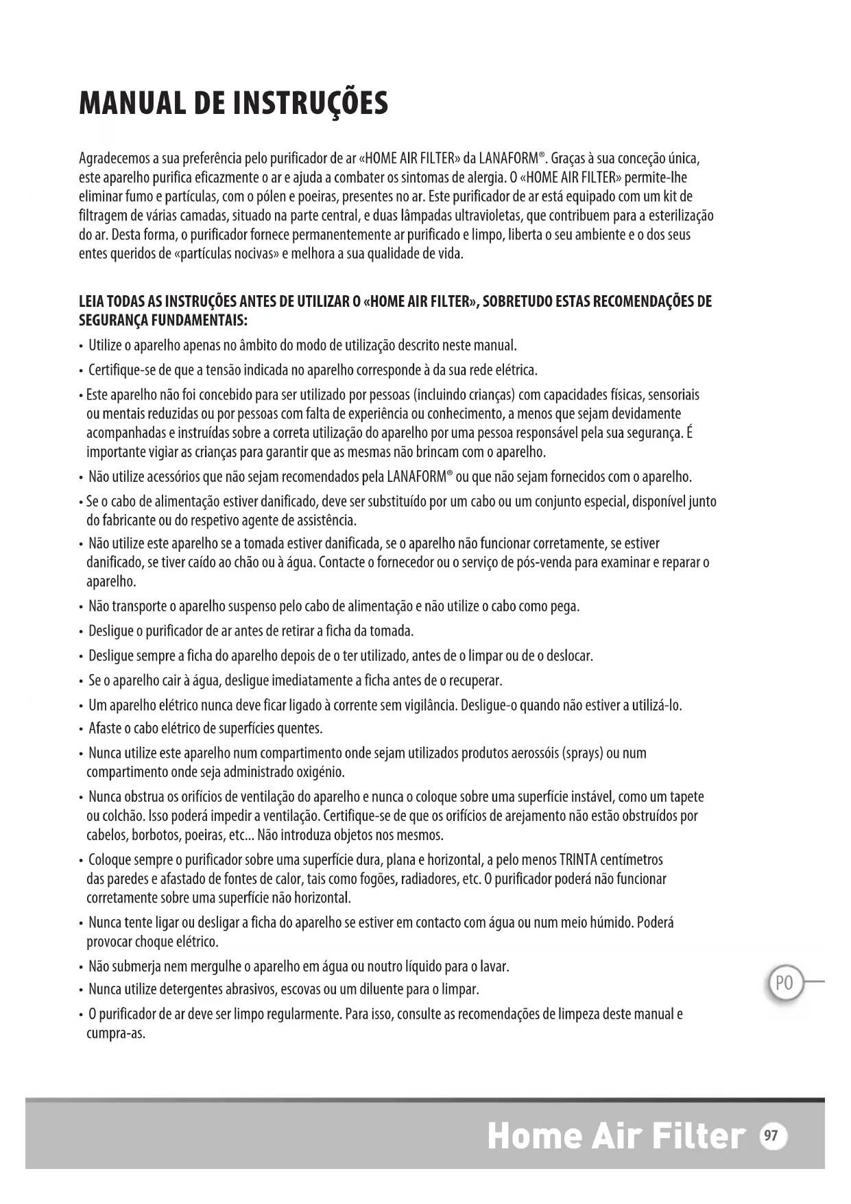Agradecemos a sua preferência pelo purificador de ar «HOME AIR FILTER» da LANAFORM®. Graças à sua conceção única, este aparelho purifica eficazmente o ar e ajuda a combater os sintomas de alergia. O «HOME AIR FILTER» permite-lhe eliminar fumo e partículas, com o pólen e poeiras, presentes no ar. Este purificador de ar está equipado com um kit de filtragem de várias camadas, situado na parte central, e duas lâmpadas ultravioletas, que contribuem para a esterilização do ar. Desta forma, o purificador fornece permanentemente ar purificado e limpo, liberta o seu ambiente e o dos seus entes queridos de «partículas nocivas» e melhora a sua qualidade de vida. LEIA TODAS AS INSTRUÇÕES ANTES DE UTILIZAR O «HOME AIR FILTER», SOBRETUDO ESTAS RECOMENDAÇÕES DE SEGURANÇA FUNDAMENTAIS:
