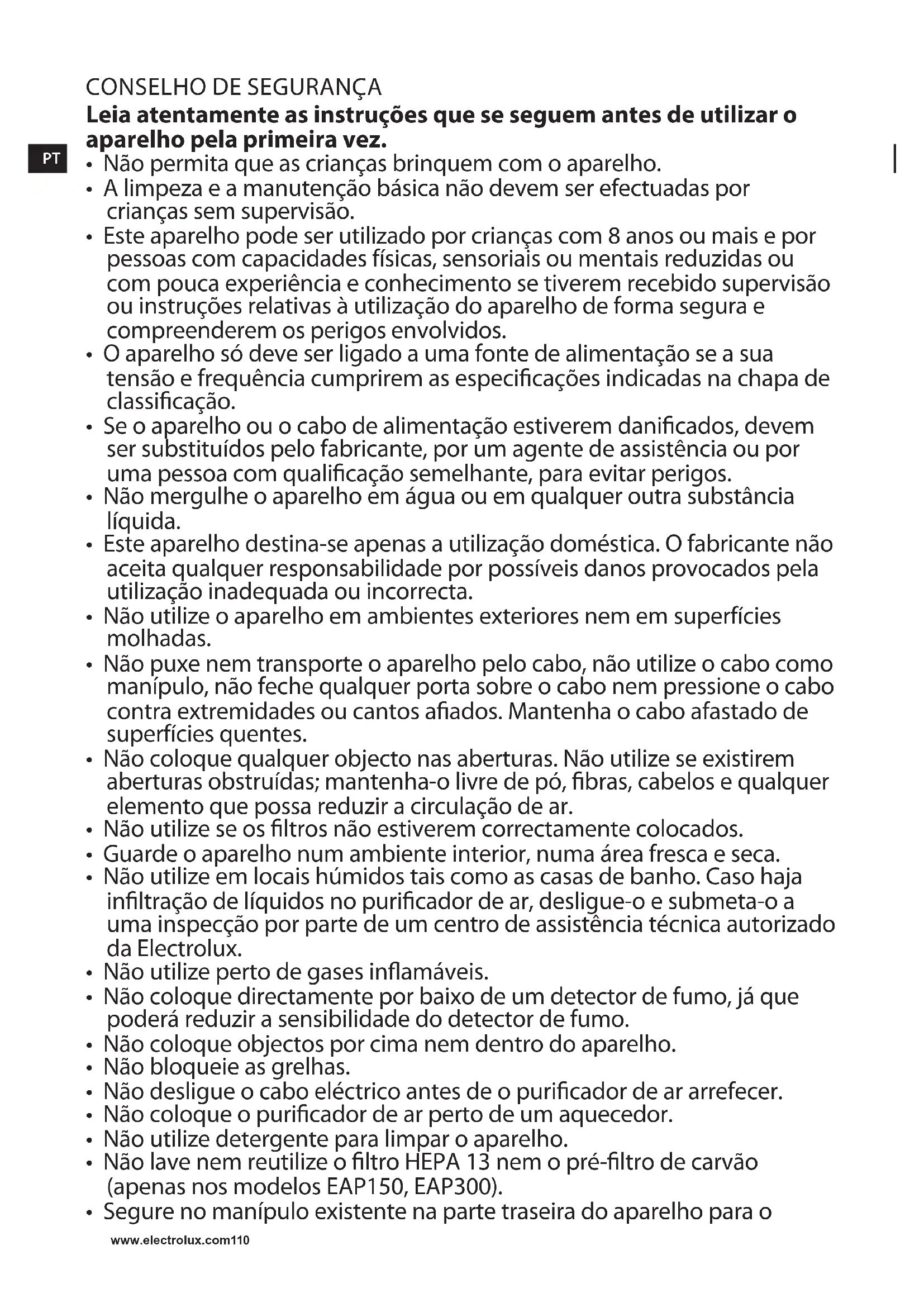 - Não utilize em locais húmidos tais como as casas de banho. Caso haja inltração de líquidos no puricador de ar, desligue-o e submeta-o a uma inspecção por parte de um centro de assistência técnica autorizado da Electrolux.