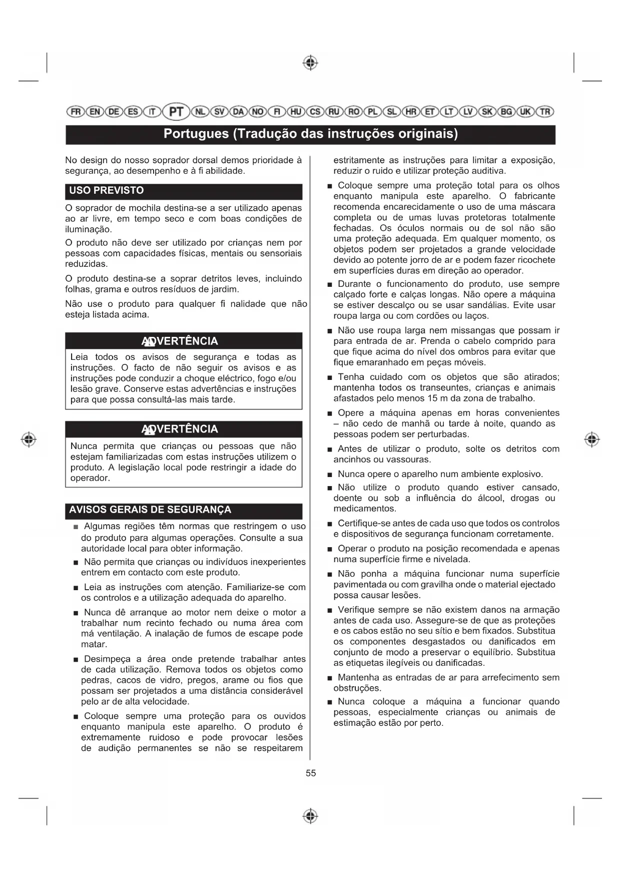NOTE: ■ La manutenzione deve essere svolta più frequentemente quando il prodotto viene utilizzato in un'area polverosa. ■ Se il prodotto ha superato i valori massimi indicati in tabella, la manutenzione deve ugualmente essere eseguita secondo gli intervalli di tempo o le ore ivi indicate.55 Portugues (Tradução das instruções originais) No design do nosso soprador dorsal demos prioridade à segurança, ao desempenho e à fi abilidade. USO PREVISTO O soprador de mochila destina-se a ser utilizado apenas ao ar livre, em tempo seco e com boas condições de iluminação. O produto não deve ser utilizado por crianças nem por pessoas com capacidades físicas, mentais ou sensoriais reduzidas. O produto destina-se a soprar detritos leves, incluindo folhas, grama e outros resíduos de jardim. Não use o produto para qualquer fi nalidade que não esteja listada acima. ADVERTÊNCIA Leia todos os avisos de segurança e todas as instruções. O facto de não seguir os avisos e as instruções pode conduzir a choque eléctrico, fogo e/ou lesão grave. Conserve estas advertências e instruções para que possa consultá-las mais tarde. ADVERTÊNCIA Nunca permita que crianças ou pessoas que não estejam familiarizadas com estas instruções utilizem o produto. A legislação local pode restringir a idade do operador.