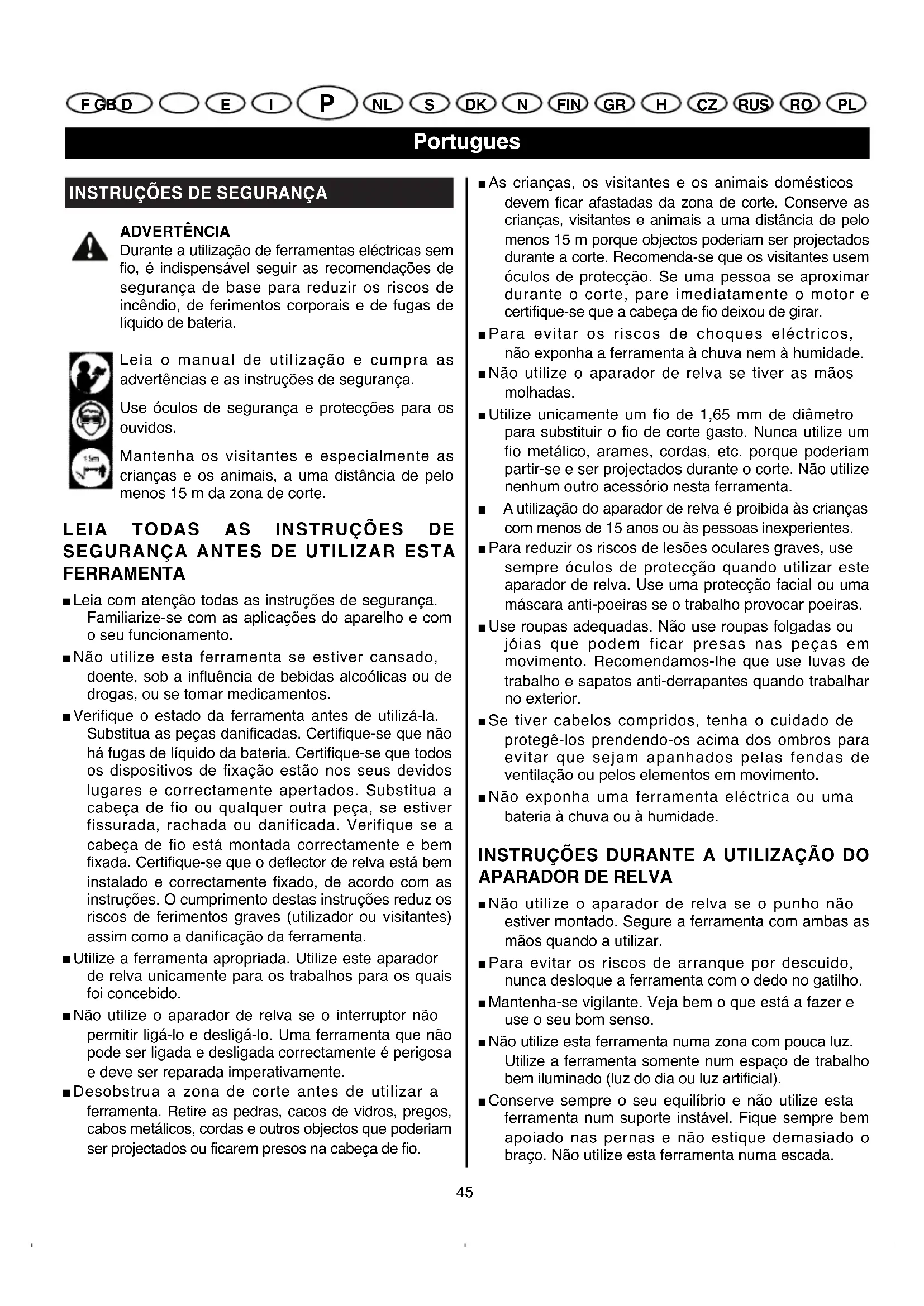 F GB D Italiano E P NL S DK N FIN GR H CZ RUS RO PL CLT-1423P / 1823 P manual 24/11/04 11:57 Page 44INSTRUÇÕES DE SEGURANÇA ADVERTÊNCIA Durante a utilização de ferramentas eléctricas sem fio, é indispensável seguir as recomendações de segurança de base para reduzir os riscos de incêndio, de ferimentos corporais e de fugas de líquido de bateria. Leia o manual de utilização e cumpra as advertências e as instruções de segurança. Use óculos de segurança e protecções para os ouvidos. Mantenha os visitantes e especialmente as crianças e os animais, a uma distância de pelo menos 15 m da zona de corte.
