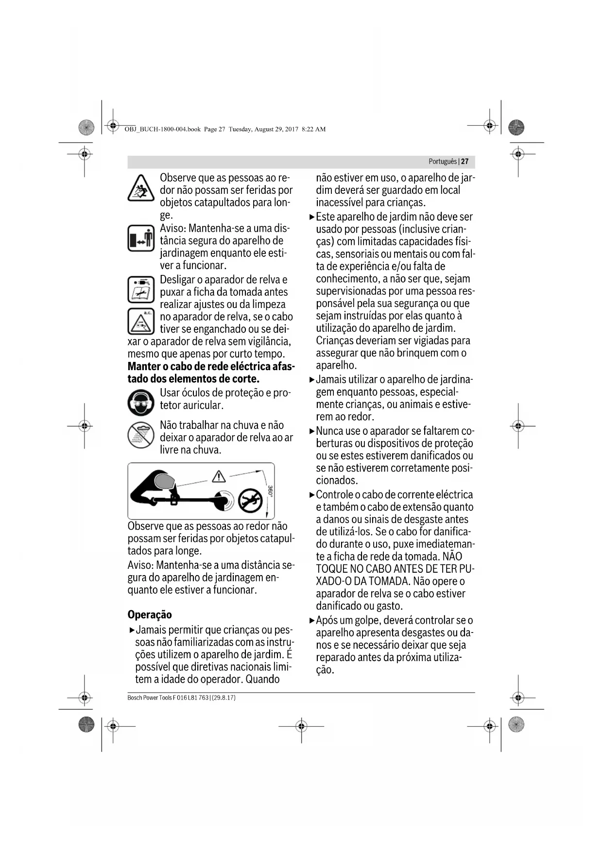 Objetivo Figura Página Síntomas Posible causa Solución El cortabordes no funciona No hay tensión de red Verificar y conectar Toma de corriente defectuosa Emplear otra toma de corriente Cable de prolongación defectuoso Verificar y sustituir el cable, si procede El fusible se ha fundido Cambiar el fusible El cortabordes funciona de forma intermitente Cable de prolongación defectuoso Verificar y sustituir el cable, si procede Acudir al servicio técnico Cableado interior de la máquina defectuoso Acudir al servicio técnico Sobrecarga del aparato para jardín Césped demasiado alto Cortar de forma escalonada El aparato para jardín no corta Elementos de corte demasiado cortos o rotos Sustituir los elementos de corte El hilo de corte no es reajustado Carrete de hilo vacío Cambiar el carrete de hilo El hilo de corte se ha enredado en el carrete Inspeccionar el carrete de hilo y enrollar de nuevo el hilo de corte si fuese preciso El hilo de corte es retraído hacia el interior del carrete El hilo de corte no sale al accionar el mecanismo de reajuste Volver a enrollar el carrete de hilo (ver figura 11) El hilo de corte se sigue rompiendo El hilo de corte se ha enredado en el carrete Inspeccionar el carrete de hilo y enrollar de nuevo el hilo de corte si fuese preciso Uso incorrecto del cortabordes Solamente trabajar con la punta del hilo de corte; evitar que toque piedras, pare- des y demás objetos sólidos. Reajustar con regularidad el hilo de corte para dis- poner siempre de la circunferencia de corte máxima. OBJ_BUCH-1800-004.book Page 25 Tuesday, August 29, 2017 8:22 AM26 | Português F 016 L81 763 | (29.8.17) Bosch Power Tools Servicio técnico y atención al cliente www.bosch-garden.com Para cualquier consulta o pedido de piezas de repuesto es im- prescindible indicar el nº de artículo de 10 dígitos que figura en la placa de características del aparato para jardín. España Robert Bosch España S.L.U. Departamento de ventas Herramientas Eléctricas Avd. de la Institución Libre de Enseñanza, 19 28037 Madrid Para efectuar su pedido online de recambios o pedir la recogi- da para la reparación de su máquina, entre en la página www.herramientasbosch.net. Tel. Asesoramiento al cliente: 902 531 553 Fax: 902 531554 Argentina Robert Bosch Argentina S.A. Calle Blanco Encalada 250 – San Isidro Código Postal B1642AMQ Ciudad Autónoma de Buenos Aires Tel.: (54) 11 5296 5200 E-Mail: herramientas.bosch@ar.bosch.com www.argentina.bosch.com.ar Chile Robert Bosch S.A. Calle El Cacique 0258 Providencia – Santiago de Chile Buzón Postal 7750000 Tel.: (56) 02 782 0200 www.bosch.cl Ecuador Robert Bosch Sociedad Anónima Av. Rodrigo Chávez Gonzalez Parque Empresarial Colón Edif. Coloncorp Piso 1 Local 101-102, Guayaquil Tel.: (593) 4 220 4000 E-mail: ventas@bosch.com.ec www.bosch.ec México Robert Bosch S. de R.L. de C.V. Calle Robert Bosch No. 405 C.P. 50071 Zona Industrial, Toluca - Estado de México Tel.: (52) 55 528430-62 Tel.: 800 6271286 www.bosch-herramientas.com.mx Perú Robert Bosch S.A.C. Av. Primavera 781 Piso 2, Urbanización Chacarilla San Borja Lima Tel.: (51) 1 706 1100 www.bosch.com.pe Venezuela Robert Bosch S.A. Calle Vargas con Buen Pastor, Edif. Alba, P-1, Boleita Norte, Caracas 1071 Tel.: (58) 212 207-4511 www.boschherramientas.com.ve Eliminación ¡No arroje los aparatos para jardín a la basura! Sólo para los países de la UE: Conforme a la Directiva Europea 2012/19/UE sobre aparatos eléctricos y electrónicos inservibles, tras su transposición en ley nacional, deberán acumularse por separado los aparatos eléctricos y electrónicos para ser sometidos a un reciclaje ecológico. Reservado el derecho de modificación. El símbolo es solamente válido, si también se encuentra sobre la placa de características del producto/fabricado. Português Indicações de segurança Atenção! Leia atentamente as se- guintes instruções. Familiarize-se com os elementos de comando e com a utilização do aparelho de jardina- gem. Guarde as instruções de servi- ço em lugar seguro para uma utiliza- ção posterior. Descrição dos pictogramas Indicação geral de perigos. Leia atentamente estas instru- ções de serviço. OBJ_BUCH-1800-004.book Page 26 Tuesday, August 29, 2017 8:22 AMPortuguês | 27 Bosch Power Tools F 016 L81 763 | (29.8.17) Observe que as pessoas ao re- dor não possam ser feridas por objetos catapultados para lon- ge. Aviso: Mantenha-se a uma dis- tância segura do aparelho de jardinagem enquanto ele esti- ver a funcionar. Desligar o aparador de relva e puxar a ficha da tomada antes realizar ajustes ou da limpeza no aparador de relva, se o cabo tiver se enganchado ou se dei- xar o aparador de relva sem vigilância, mesmo que apenas por curto tempo. Manter o cabo de rede eléctrica afas- tado dos elementos de corte. Usar óculos de proteção e pro- tetor auricular. Não trabalhar na chuva e não deixar o aparador de relva ao ar livre na chuva. Observe que as pessoas ao redor não possam ser feridas por objetos catapul- tados para longe. Aviso: Mantenha-se a uma distância se- gura do aparelho de jardinagem en- quanto ele estiver a funcionar. Operação Jamais permitir que crianças ou pes- soas não familiarizadas com as instru- ções utilizem o aparelho de jardim. É possível que diretivas nacionais limi- tem a idade do operador. Quando não estiver em uso, o aparelho de jar- dim deverá ser guardado em local inacessível para crianças. Este aparelho de jardim não deve ser usado por pessoas (inclusive crian- ças) com limitadas capacidades físi- cas, sensoriais ou mentais ou com fal- ta de experiência e/ou falta de conhecimento, a não ser que, sejam supervisionadas por uma pessoa res- ponsável pela sua segurança ou que sejam instruídas por elas quanto à utilização do aparelho de jardim. Crianças deveriam ser vigiadas para assegurar que não brinquem com o aparelho. Jamais utilizar o aparelho de jardina- gem enquanto pessoas, especial- ment