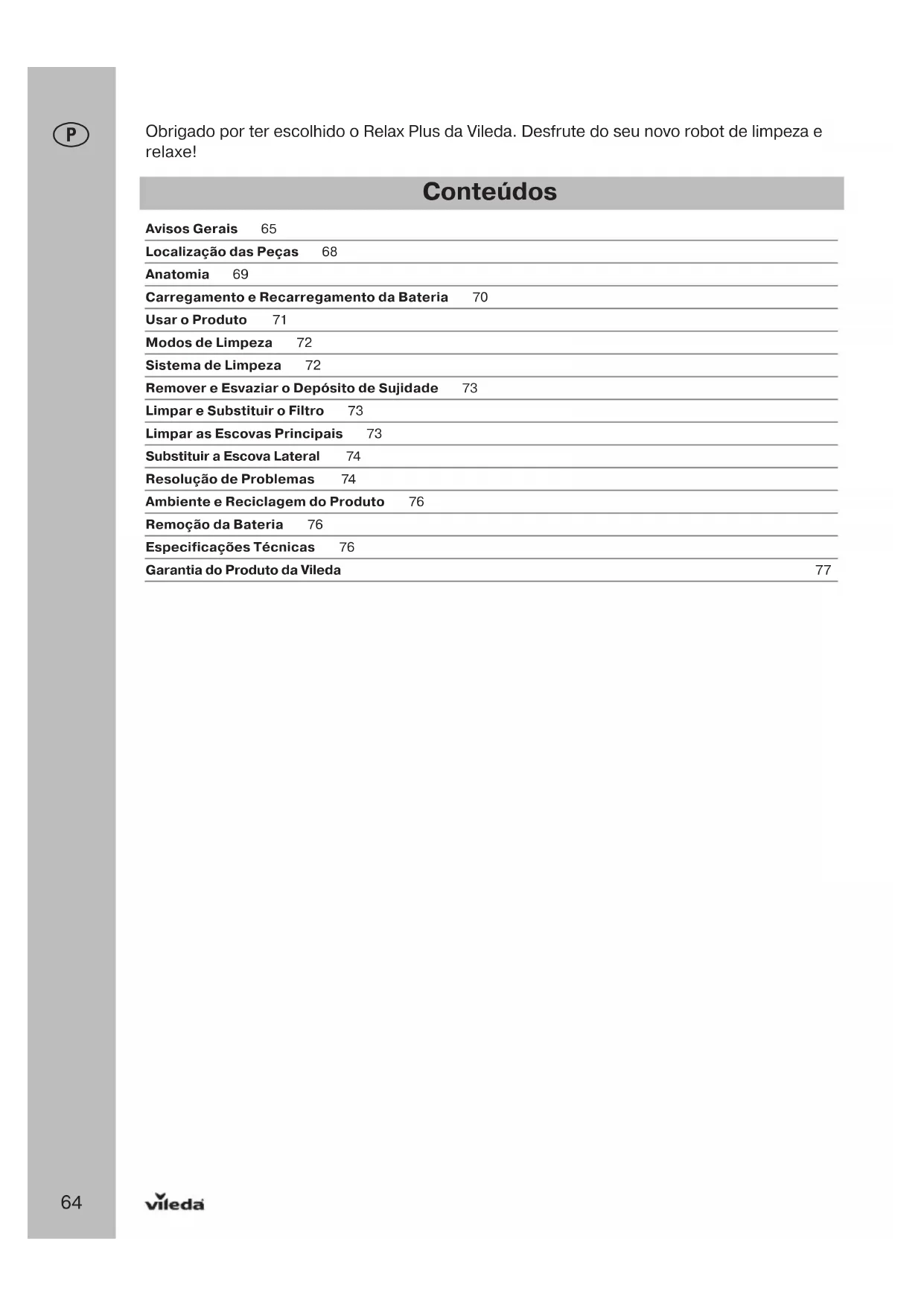 Obrigado por ter escolhido o Relax Plus da Vileda. Desfrute do seu novo robot de limpeza e relaxe! Conteúdos Avisos Gerais 65 Localização das Peças 68 Anatomia 69 Carregamento e Recarregamento da Bateria 70 Usar o Produto 71 Modos de Limpeza 72 Sistema de Limpeza 72 Remover e Esvaziar o Depósito de Sujidade 73 Limpar e Substituir o Filtro 73 Limpar as Escovas Principais 73 Substituir a Escova Lateral 74 Resolução de Problemas 74 Ambiente e Reciclagem do Produto 76 Remoção da Bateria 76 Especificações Técnicas 76 Garantia do Produto da Vileda 7765