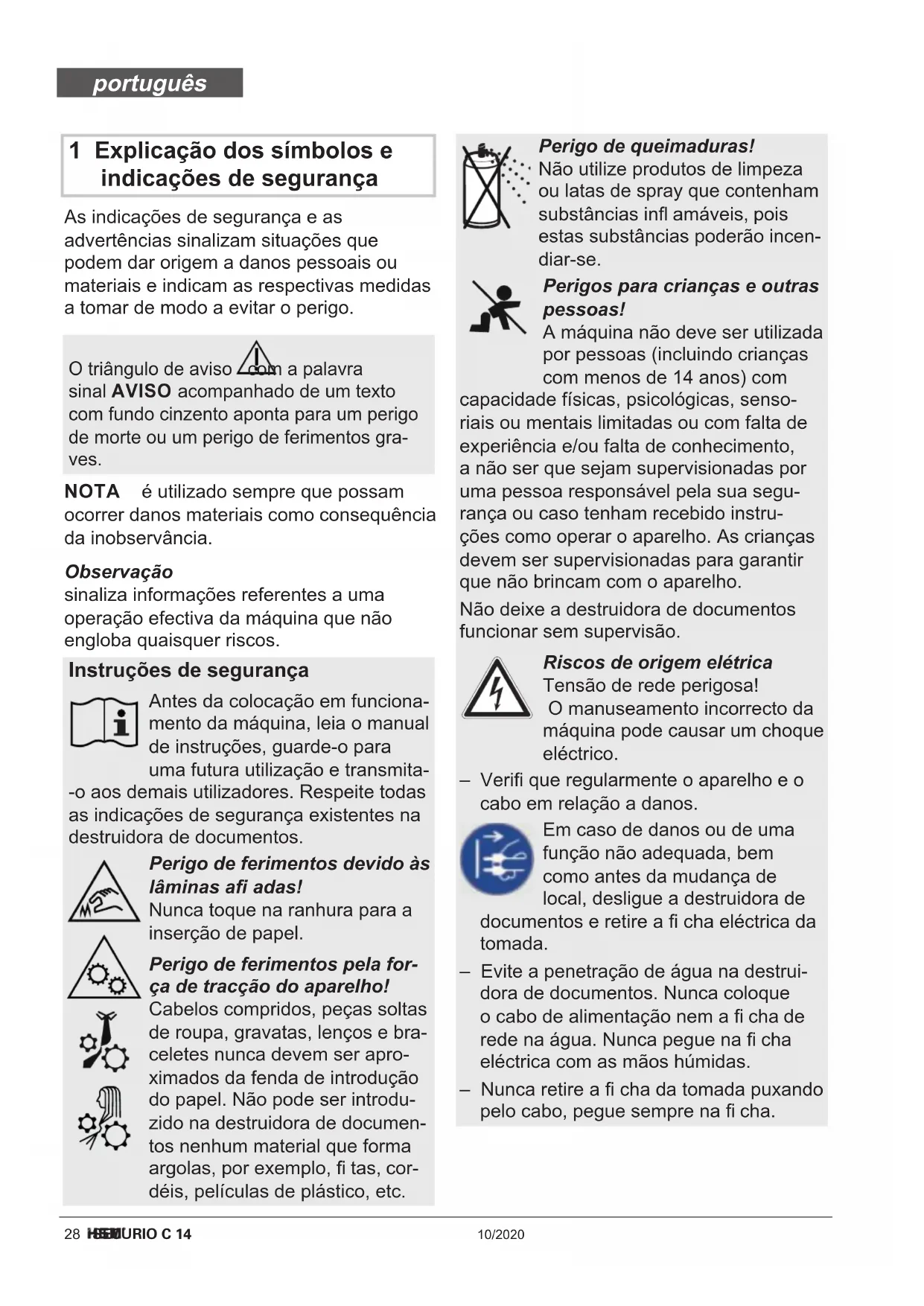 Peso 4,0 kg 4,5 kg Consumo de potencia con número máx. de hojas 160 W (EU) / 145 W (US) Nivel de emisión de ruidos (Marcha en vacío / carga) 55-60 dB(A) / 60-65 dB(A) 55-60 dB(A) / 65-70 dB(A) Anchura de entrada 225 mm Velocidad de corte 44 mm/s Conexión 220-240 V / 50/60 Hz 110-130 V / 60 Hz Consumo de energía en el modo de espera < 2 Wh Tiempo de servicio hasta 15 min Condiciones ambientales durante el fun- cionamiento: Temperatura Humedad relativa del aire Altura sobre el nivel del mar de -10 °C a +25 °C máx. 90 %, sin condensación máx. 2.000 m Medidas A x P x H (mm) 366 x 258 x 405 Volumen del depósito para recortes 20 l A- Nivel de potencia acústica evaluado (LW / Ad al ralentí) 65,9 dB español28 SECURIO C 14 10/2020 1 Explicação dos símbolos e indicações de segurança As indicações de segurança e as advertências sinalizam situações que podem dar origem a danos pessoais ou materiais e indicam as respectivas medidas a tomar de modo a evitar o perigo. Observação sinaliza informações referentes a uma operação efectiva da máquina que não engloba quaisquer riscos. O triângulo de aviso com a palavra sinal AVISO acompanhado de um texto com fundo cinzento aponta para um perigo de morte ou um perigo de ferimentos gra- ves. NOTA é utilizado sempre que possam ocorrer danos materiais como consequência da inobservância. Instruções de segurança Antes da colocação em funciona- mento da máquina, leia o manual de instruções, guarde-o para uma futura utilização e transmita- -o aos demais utilizadores. Respeite todas as indicações de segurança existentes na destruidora de documentos. Perigo de ferimentos devido às lâminas afi adas! Nunca toque na ranhura para a inserção de papel. Perigo de ferimentos pela for- ça de tracção do aparelho! Cabelos compridos, peças soltas de roupa, gravatas, lenços e bra- celetes nunca devem ser apro- ximados da fenda de introdução do papel. Não pode ser introdu- zido na destruidora de documen- tos nenhum material que forma argolas, por exemplo, fi tas, cor- déis, películas de plástico, etc. Perigo de queimaduras! Não utilize produtos de limpeza ou latas de spray que contenham substâncias infl amáveis, pois estas substâncias poderão incen- diar-se. Perigos para crianças e outras pessoas! A máquina não deve ser utilizada por pessoas (incluindo crianças com menos de 14 anos) com capacidade físicas, psicológicas, senso- riais ou mentais limitadas ou com falta de experiência e/ou falta de conhecimento, a não ser que sejam supervisionadas por uma pessoa responsável pela sua segu- rança ou caso tenham recebido instru- ções como operar o aparelho. As crianças devem ser supervisionadas para garantir que não brincam com o aparelho. Não deixe a destruidora de documentos funcionar sem supervisão. Riscos de origem elétrica Tensão de rede perigosa! O manuseamento incorrecto da máquina pode causar um choque eléctrico. – Verifi que regularmente o aparelho e o cabo em relação a danos. Em caso de danos ou de uma função não adequada, bem como antes da mudança de local, desligue a destruidora de documentos e retire a fi cha eléctrica da tomada. – Evite a penetração de água na destrui- dora de documentos. Nunca coloque o cabo de alimentação nem a fi cha de rede na água. Nunca pegue na fi cha eléctrica com as mãos húmidas. – Nunca retire a fi cha da tomada puxando pelo cabo, pegue sempre na fi cha. português10/2020 SECURIO C 14 29 3 Vista geral 4 Volume do fornecimento