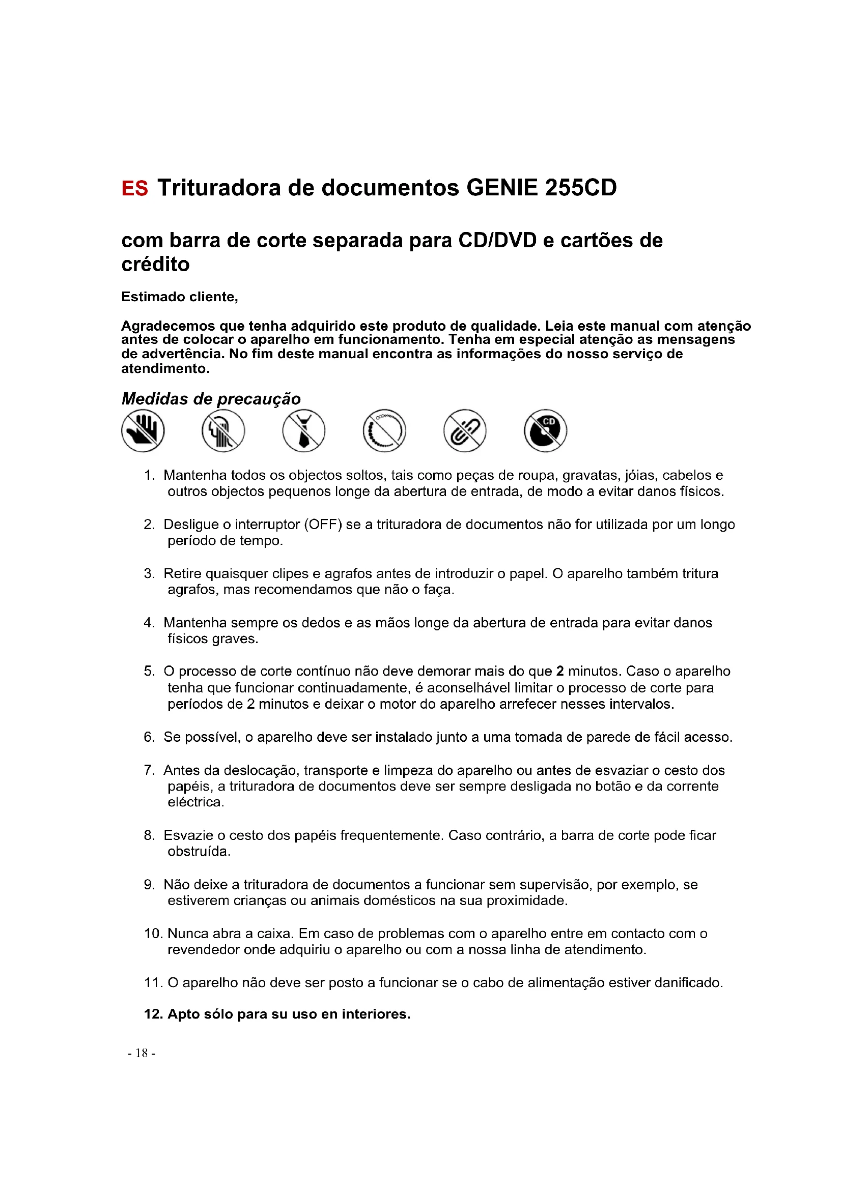 período de tempo, deve ser desligado (OFF) e a ficha deve ser retirada da tomada. Este aparelho foi concebido apenas para utilização doméstica em espaços fechados e para um funcionamento breve de 2 minutos. Não utilize a trituradora de documentos industrialmente nem ao ar livre.- 20 - A trituradora de documentos dispõe também de um interruptor "Clear". Prima-o caso o processo de corte termine antes do tempo sem triturar completamente o papel. Com o accionamento do interruptor Clear, o papel é totalmente recolhido no cesto dos papéis. Capacidade da trituradora de documentos: A trituradora 255CD tritura até 7 de folhas de papel (DIN A4, 70 g). O papel pode ter até 22 cm de largura. Ao triturar papéis pequenos, como por exemplo, envelopes ou recibos de cartão de crédito, introduza-os no meio da abertura de corte. Certifique-se de que não introduz na barra de corte mais do que a quantidade máxima acima indicada. Caso contrário, o aparelho poderá ser danificado Barra de corte separada para CD e cartões de crédito: Esta trituradora de documentos está equipada com uma barra de corte separada para CD/DVD e cartões de créditos. Os CD/DVD são cortados em 4 partes. Uma vez que com este tipo de material existe sempre o perigo de saltar fragmentos, mantenha a cara suficientemente afastada ao introduzir um CD/DVD. As partes cortadas são recolhidas num depósito separado, facilitando assim a separação de materiais para reciclagem.