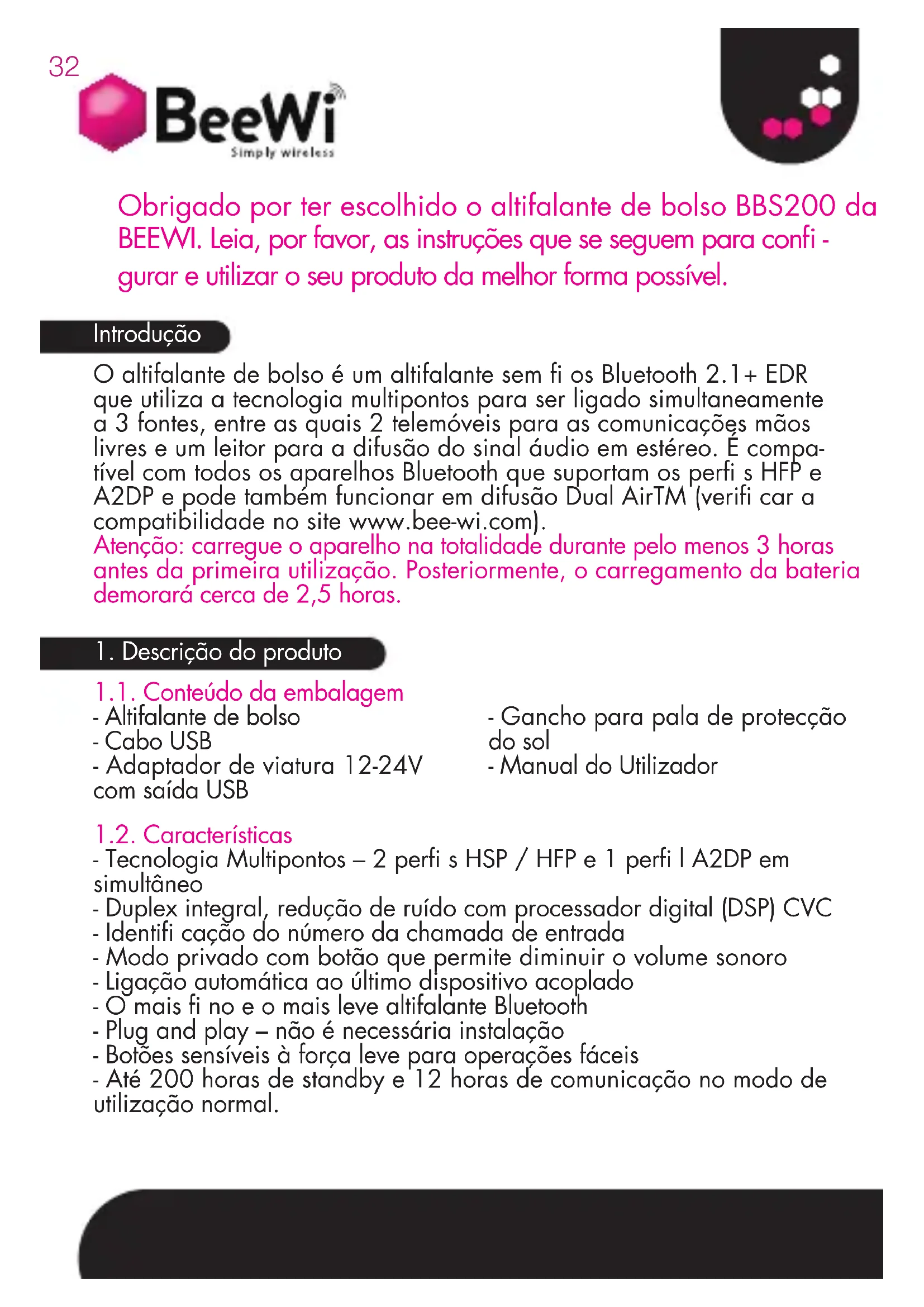 ESPANOL Notice Bluetooth hands fress car kit_Reparee.indd 31 19/03/09 15:51:3932 O altifalante de bolso é um altifalante sem fi os Bluetooth 2.1+ EDR que utiliza a tecnologia multipontos para ser ligado simultaneamente a 3 fontes, entre as quais 2 telemóveis para as comunicações mãos livres e um leitor para a difusão do sinal áudio em estéreo. É compa- tível com todos os aparelhos Bluetooth que suportam os perfi s HFP e A2DP e pode também funcionar em difusão Dual AirTM (verifi car a compatibilidade no site www.bee-wi.com). Atenção: carregue o aparelho na totalidade durante pelo menos 3 horas antes da primeira utilização. Posteriormente, o carregamento da bateria demorará cerca de 2,5 horas. 1.3. Especifi cações Especifi cação Bluetooth Bluetooth V2.1+EDR Perfi s Bluetooth HSP - HFP1.5 - A2DP - AVRCP Banda de frequência 2,4 GHz~2,4835 GHz Banda ISM Alcance Classe 2, até 10 metros Autonomia em standby Até 200 horas Autonomia em conversação Até 12 horas Autonomia para a música Até 10,3 horas Bateria 600 mAH Li-Polímero Peso 32 g 1.1. Conteúdo da embalagem - Altifalante de bolso - Cabo USB - Adaptador de viatura 12-24V com saída USB - Gancho para pala de protecção do sol - Manual do Utilizador 1.2. Características - Tecnologia Multipontos – 2 perfi s HSP / HFP e 1 perfi l A2DP em simultâneo - Duplex integral, redução de ruído com processador digital (DSP) CVC - Identifi cação do número da chamada de entrada - Modo privado com botão que permite diminuir o volume sonoro - Ligação automática ao último dispositivo acoplado - O mais fi no e o mais leve altifalante Bluetooth - Plug and play – não é necessária instalação - Botões sensíveis à força leve para operações fáceis - Até 200 horas de standby e 12 horas de comunicação no modo de utilização normal. Introdução Obrigado por ter escolhido o altifalante de bolso BBS200 da BEEWI. Leia, por favor, as instruções que se seguem para confi - gurar e utilizar o seu produto da melhor forma possível. PORTUGUES