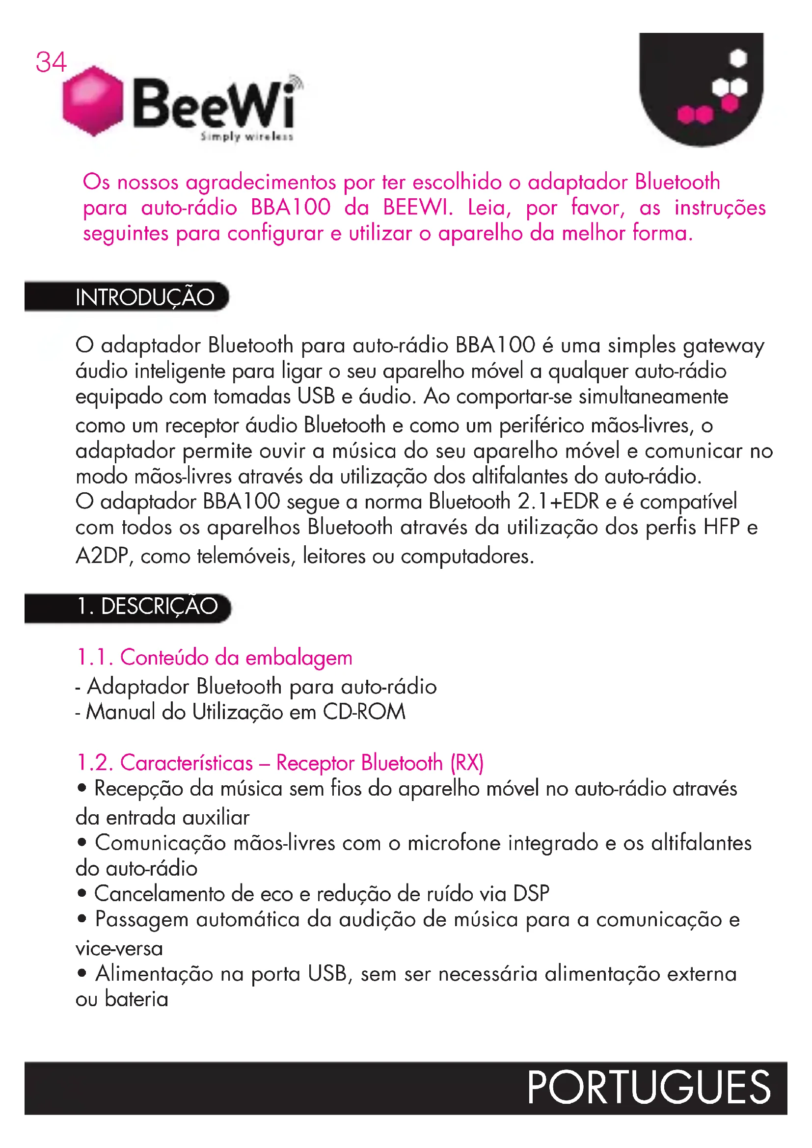 - Alimentação na porta USB, sem ser necessária alimentação externa ou bateria INTRODUÇÃO Os nossos agradecimentos por ter escolhido o adaptador Bluetooth para auto-rádio BBA100 da BEEWI. Leia, por favor, as instruções seguintes para configurar e utilizar o aparelho da melhor forma.