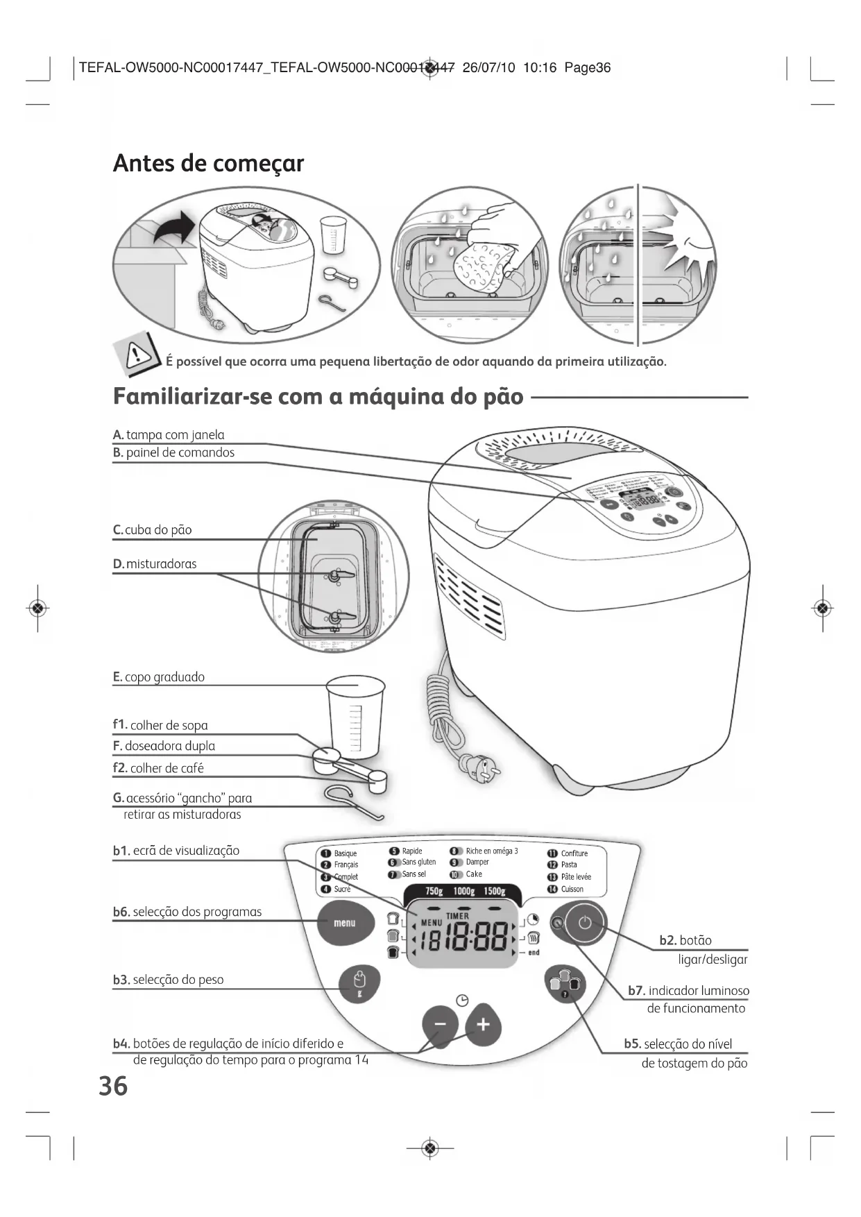 TEFAL-OW5000-NC00017447_TEFAL-OW5000-NC00017447 26/07/10 10:16 Page3536 BasiqueFrançaisCompletRapideSans glutenSans selRiche en oméga 3Damper Cake SucréConfiturePastaPâte levéeCuisson Antes de começar Bas iqueFran çai sCom pletRap ideSan s gl utenSan s se lRic he e n om éga 3Dam perCak eSCon fitu rePast aPât e le véeC É possível que ocorra uma pequena libertação de odor aquando da primeira utilização. Familiarizar-se com a máquina do pão