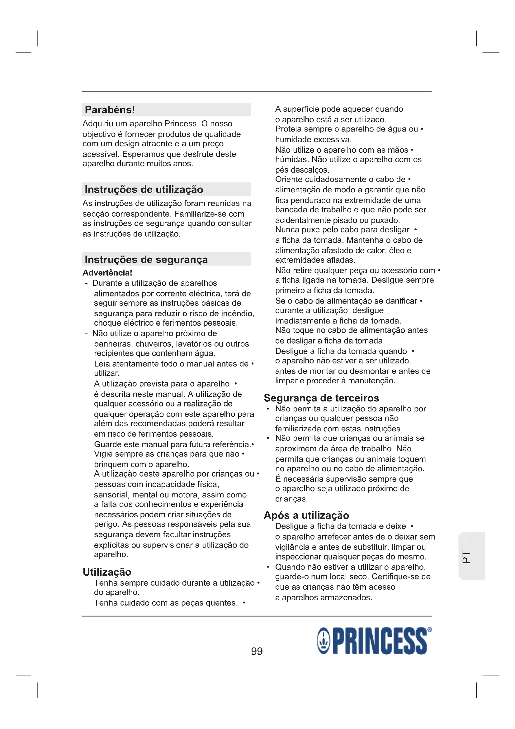 Parabéns! Adquiriu um aparelho Princess. O nosso objectivo é fornecer produtos de qualidade com um design atraente e a um preço acessível. Esperamos que desfrute deste aparelho durante muitos anos. Instruções de utilização As instruções de utilização foram reunidas na secção correspondente. Familiarize-se com as instruções de segurança quando consultar as instruções de utilização. Instruções de segurança Advertência! - Durante a utilização de aparelhos alimentados por corrente eléctrica, terá de seguir sempre as instruções básicas de segurança para reduzir o risco de incêndio, choque eléctrico e ferimentos pessoais. - Não utilize o aparelho próximo de banheiras, chuveiros, lavatórios ou outros recipientes que contenham água. Leia atentamente todo o manual antes de • utilizar. A utilização prevista para o aparelho • é descrita neste manual. A utilização de qualquer acessório ou a realização de qualquer operação com este aparelho para além das recomendadas poderá resultar em risco de ferimentos pessoais. Guarde este manual para futura referência.• Vigie sempre as crianças para que não • brinquem com o aparelho. A utilização deste aparelho por crianças ou • pessoas com incapacidade física, sensorial, mental ou motora, assim como a falta dos conhecimentos e experiência necessários podem criar situações de perigo. As pessoas responsáveis pela sua segurança devem facultar instruções explícitas ou supervisionar a utilização do aparelho. Utilização Tenha sempre cuidado durante a utilização • do aparelho. Tenha cuidado com as peças quentes. • A superfície pode aquecer quando o aparelho está a ser utilizado. Proteja sempre o aparelho de água ou • humidade excessiva. Não utilize o aparelho com as mãos • húmidas. Não utilize o aparelho com os pés descalços. Oriente cuidadosamente o cabo de • alimentação de modo a garantir que não fica pendurado na extremidade de uma bancada de trabalho e que não pode ser acidentalmente pisado ou puxado. Nunca puxe pelo cabo para desligar • a ficha da tomada. Mantenha o cabo de alimentação afastado de calor, óleo e extremidades afiadas. Não retire qualquer peça ou acessório com • a ficha ligada na tomada. Desligue sempre primeiro a ficha da tomada. Se o cabo de alimentação se danificar • durante a utilização, desligue imediatamente a ficha da tomada. Não toque no cabo de alimentação antes de desligar a ficha da tomada. Desligue a ficha da tomada quando • o aparelho não estiver a ser utilizado, antes de montar ou desmontar e antes de limpar e proceder à manutenção. Segurança de terceiros Não permita a utilização do aparelho por • crianças ou qualquer pessoa não familiarizada com estas instruções. Não permita que crianças ou animais se • aproximem da área de trabalho. Não permita que crianças ou animais toquem no aparelho ou no cabo de alimentação. É necessária supervisão sempre que o aparelho seja utilizado próximo de crianças. Após a utilização Desligue a ficha da tomada e deixe • o aparelho arrefecer antes de o deixar sem vigilância e antes de substituir, limpar ou inspeccionar quaisquer peças do mesmo. Quando não estiver a utilizar o aparelho, • guarde-o num local seco. Certifique-se de que as crianças não têm acesso a aparelhos armazenados.100