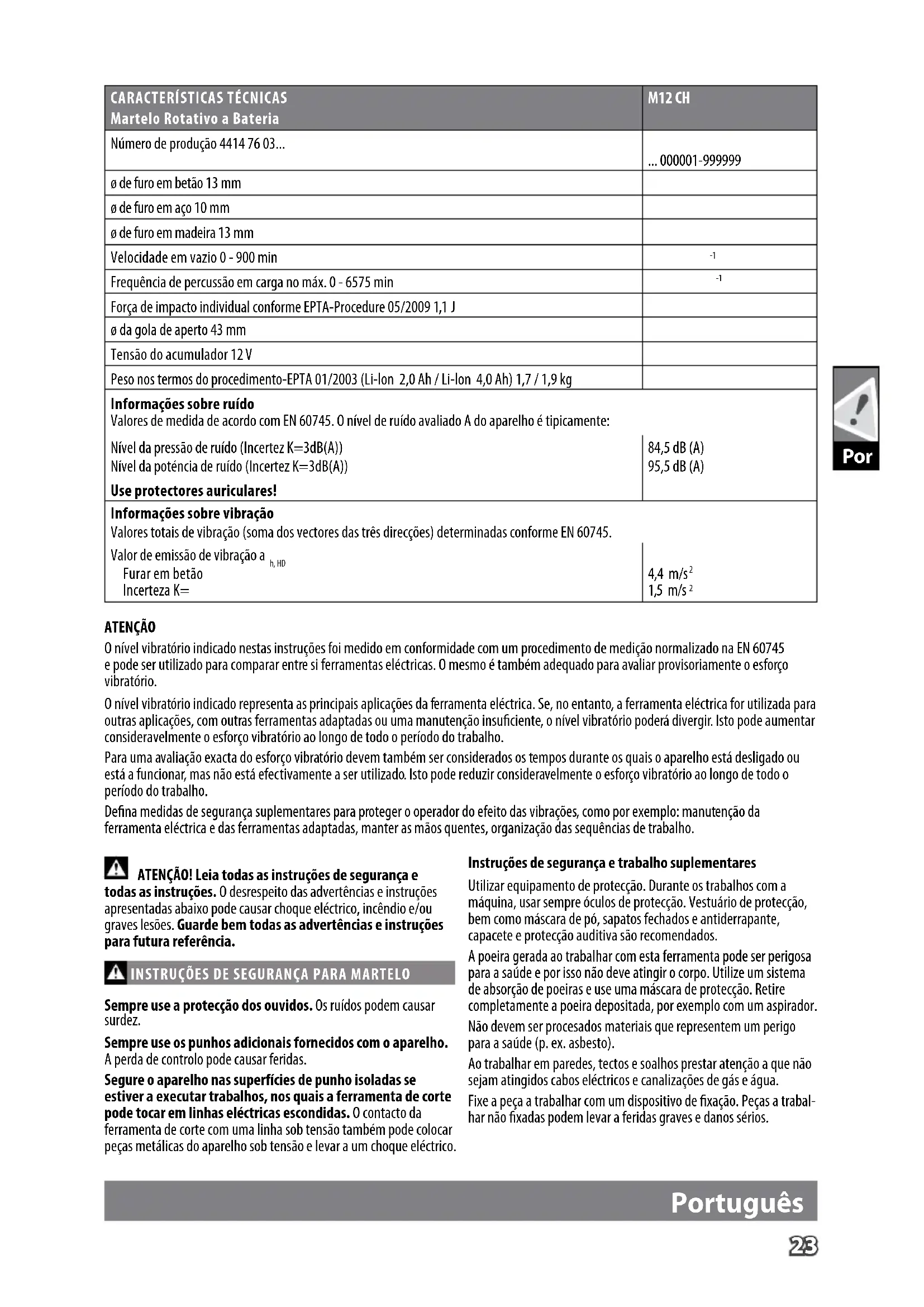 Força de impacto individual conforme EPTA-Procedure 05/2009 1,1 J ø da gola de aperto 43 mm Tensão do acumulador 12 V Peso nos termos do procedimento-EPTA 01/2003 (Li-lon 2,0 Ah / Li-lon 4,0 Ah) 1,7 / 1,9 kg Informações sobre ruído Valores de medida de acordo com EN 60745. O nível de ruído avaliado A do aparelho é tipicamente: Nível da pressão de ruído (Incertez K=3dB(A)) Nível da poténcia de ruído (Incertez K=3dB(A)) 84,5 dB (A) 95,5 dB (A) Use protectores auriculares! Informações sobre vibração Valores totais de vibração (soma dos vectores das três direcções) determinadas conforme EN 60745. Valor de emissão de vibração a h, HD Furar em betão Incerteza K= 4,4 m/s