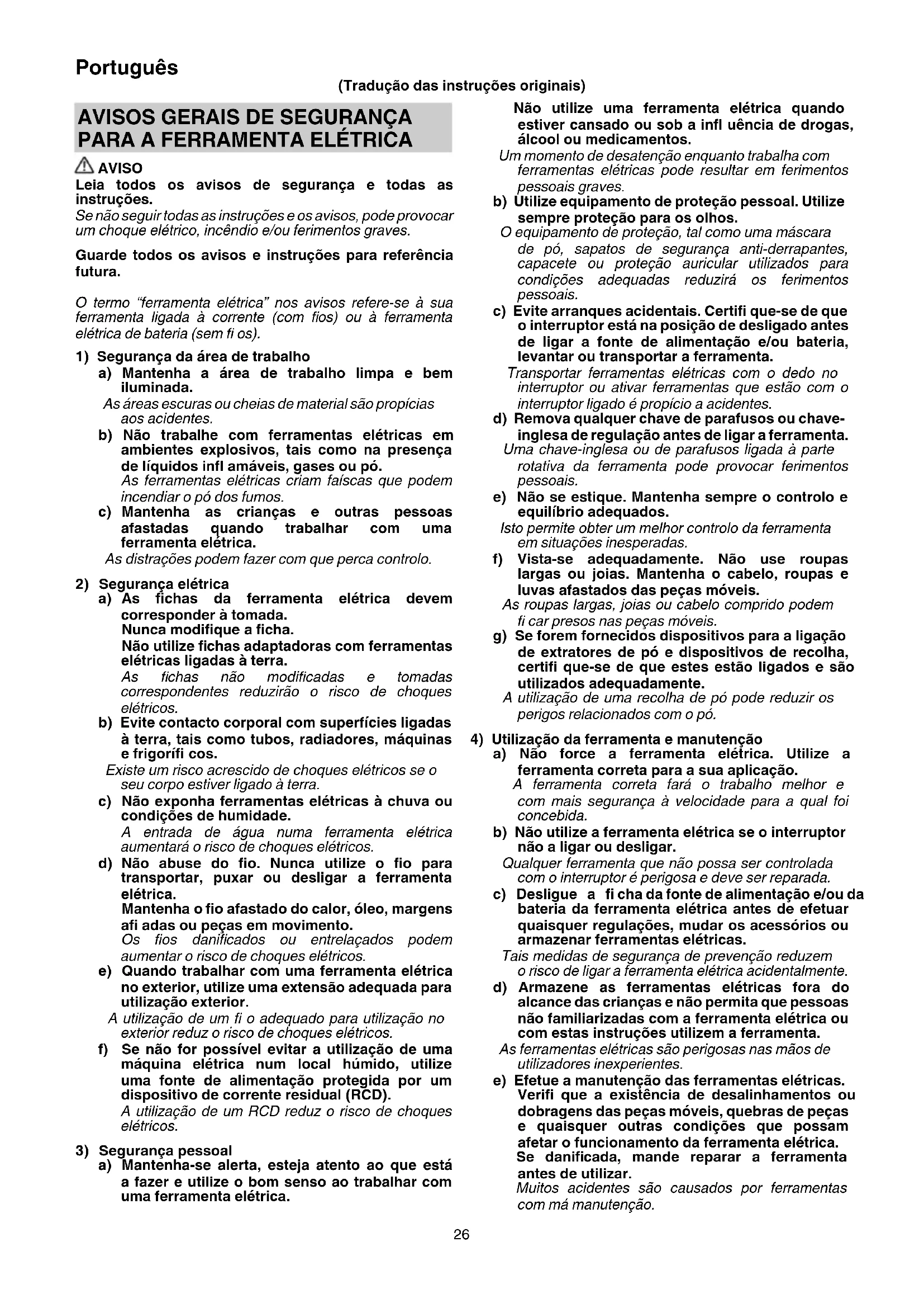 AVISO Leia todos os avisos de segurança e todas as instruções. Se não seguir todas as instruções e os avisos, pode provocar um choque elétrico, incêndio e/ou ferimentos graves. Guarde todos os avisos e instruções para referência futura. O termo “ferramenta elétrica” nos avisos refere-se à sua ferramenta ligada à corrente (com fi os) ou à ferramenta elétrica de bateria (sem fi os).