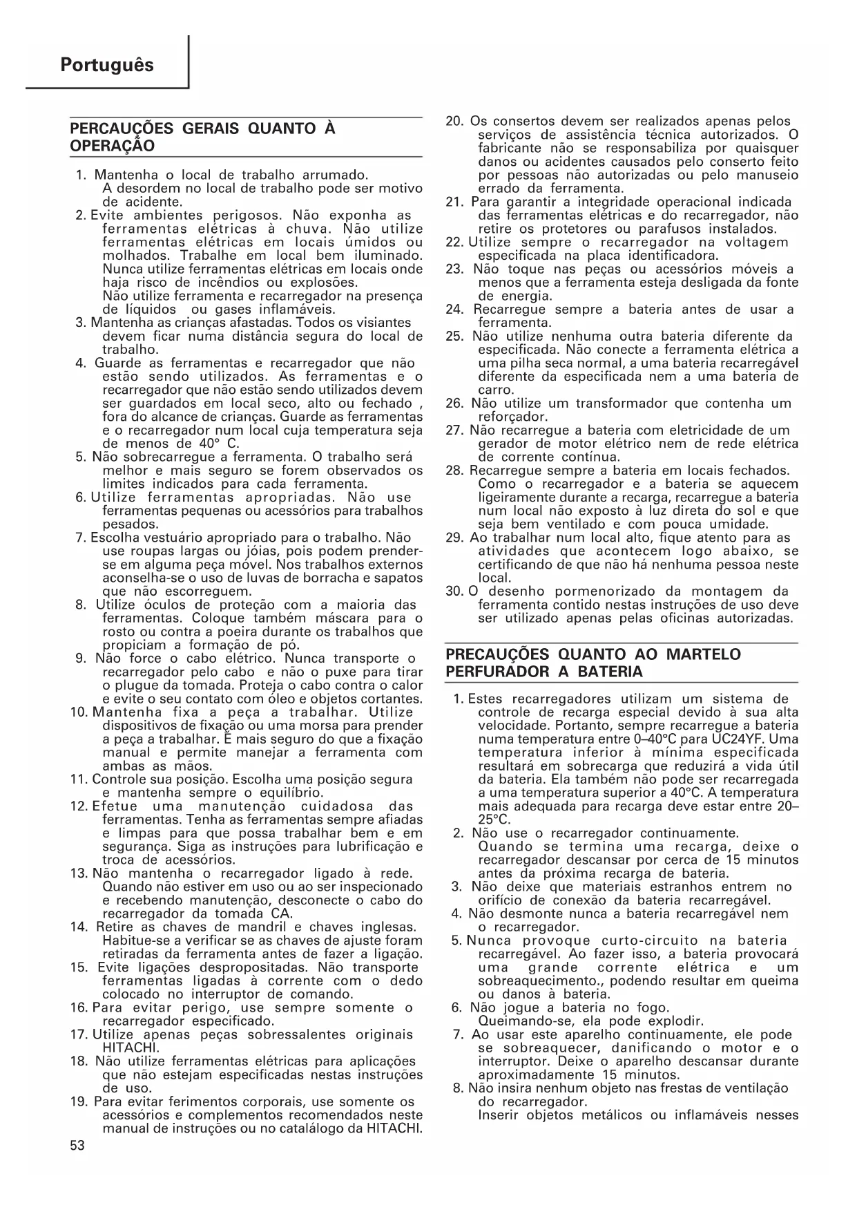acessórios e complementos recomendados neste manual de instruções ou no catalálogo da HITACHI.