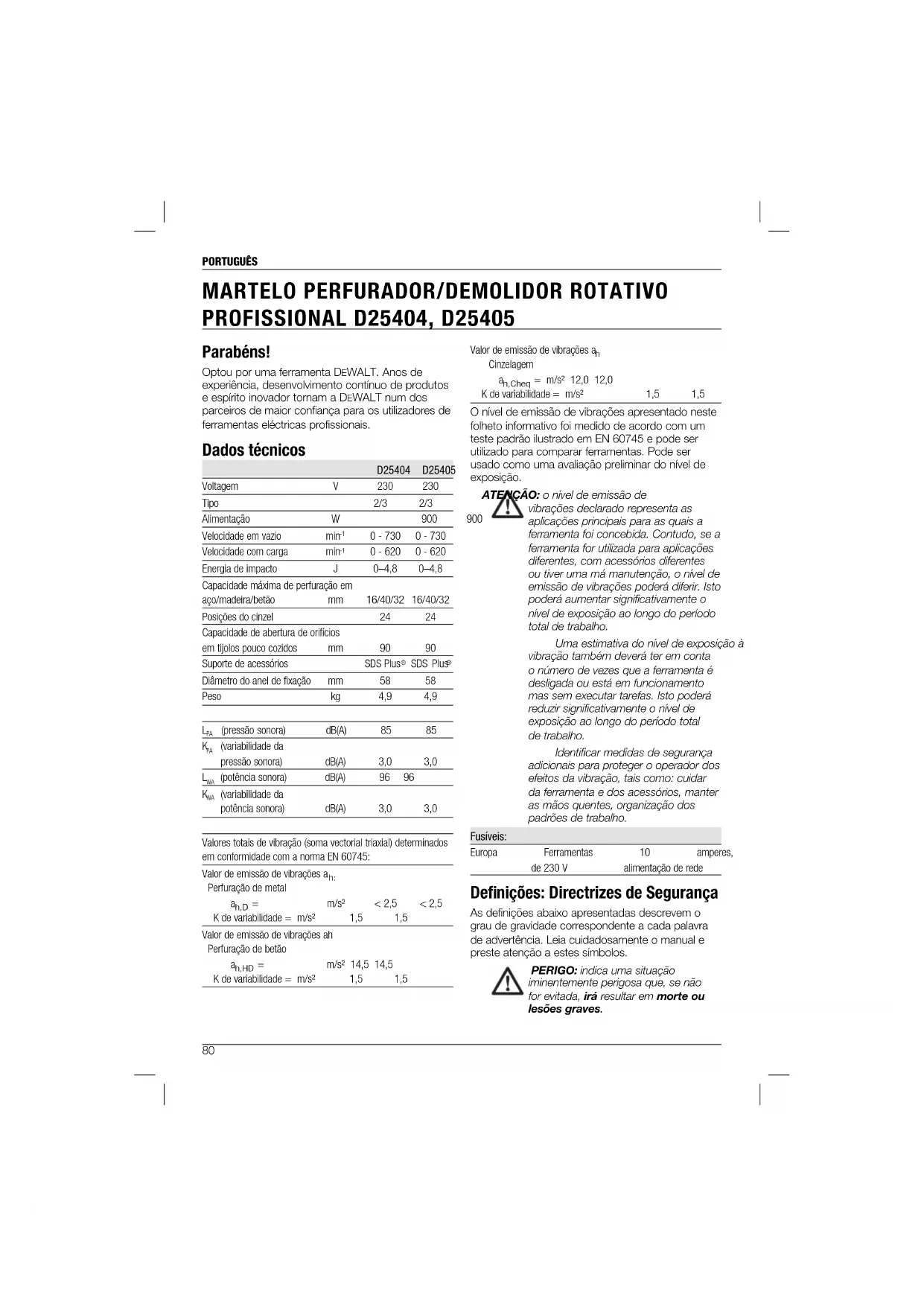 h,Cheq = m/s² 12,0 12,0 K de variabilidade = m/s² 1,5 1,5 O nível de emissão de vibrações apresentado neste folheto informativo foi medido de acordo com um teste padrão ilustrado em EN 60745 e pode ser utilizado para comparar ferramentas. Pode ser usado como uma avaliação preliminar do nível de exposição. ATENÇÃO: o nível de emissão de vibrações declarado representa as aplicações principais para as quais a ferramenta foi concebida. Contudo, se a ferramenta for utilizada para aplicações diferentes, com acessórios diferentes ou tiver uma má manutenção, o nível de emissão de vibrações poderá diferir. Isto poderá aumentar significativamente o nível de exposição ao longo do período total de trabalho. Uma estimativa do nível de exposição à vibração também deverá ter em conta o número de vezes que a ferramenta é desligada ou está em funcionamento mas sem executar tarefas. Isto poderá reduzir significativamente o nível de exposição ao longo do período total de trabalho. Identificar medidas de segurança adicionais para proteger o operador dos efeitos da vibração, tais como: cuidar da ferramenta e dos acessórios, manter as mãos quentes, organização dos padrões de trabalho. Fusíveis: Europa Ferramentas 10 amperes, de 230 V alimentação de rede Defi nições: Directrizes de Segurança As definições abaixo apresentadas descrevem o grau de gravidade correspondente a cada palavra de advertência. Leia cuidadosamente o manual e preste atenção a estes símbolos. PERIGO: indica uma situação iminentemente perigosa que, se não for evitada, irá resultar em morte ou lesões graves. Parabéns! Optou por uma ferramenta DEWALT. Anos de experiência, desenvolvimento contínuo de produtos e espírito inovador tornam a DEWALT num dos parceiros de maior confiança para os utilizadores de ferramentas eléctricas profissionais. Dados técnicos D25404 D25405 Voltagem V 230 230 Tipo 2/3 2/3 Alimentação W 900 900 Velocidade em vazio min