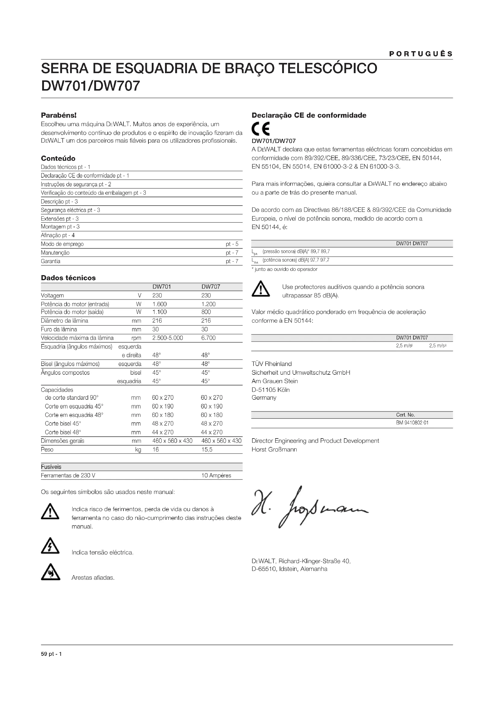 TÜV Rheinland Sicherheit und Umweltschutz GmbH Am Grauen Stein D-51105 Köln Germany Cert. No.BM 9410802 01 Director Engineering and Product Development Horst Großmann DEWALT, Richard-Klinger-Straße 40, D-65510, Idstein, Alemanha Parabéns! Escolheu uma máquina DEWALT. Muitos anos de experiência, um desenvolvimento contínuo de produtos e o espírito de inovação fizeram da DEWALT um dos parceiros mais fiáveis para os utilizadores profissionais. Conteúdo Dados técnicos pt - 1 Declaração CE de conformidade pt - 1 Instruções de segurança pt - 2 Verificação do conteúdo da embalagem pt - 3 Descrição pt - 3 Segurança eléctrica pt - 3 Extensões pt - 3 Montagem pt - 3 Afinação pt - 4 Modo de emprego pt - 5 Manutenção pt - 7 Garantia pt - 7 Dados técnicos DW701 DW707 Voltagem V 230 230 Potência do motor (entrada) W 1.600 1.200 Potência do motor (saída) W 1.100 800 Diâmetro da lâmina mm 216 216 Furo da lâmina mm 30 30 Velocidade máxima da lâmina rpm 2.500-5.000 6.700 Esquadria (ângulos máximos) esquerda e direita 48° 48° Bisel (ângulos máximos) esquerda 48° 48° Ângulos compostos bisel 45° 45° esquadria 45° 45° Capacidades de corte standard 90° mm 60 x 270 60 x 270 Corte em esquadria 45° mm 60 x 190 60 x 190 Corte em esquadria 48° mm 60 x 180 60 x 180 Corte bisel 45° mm 48 x 270 48 x 270 Corte bisel 48° mm 44 x 270 44 x 270 Dimensões gerais mm 460 x 560 x 430 460 x 560 x 430 Peso kg 16 15,5 Fusíveis Ferramentas de 230 V 10 Ampéres Os seguintes símbolos são usados neste manual: Indica risco de ferimentos, perda de vida ou danos à ferramenta no caso do não-cumprimento das instruções deste manual. Indica tensão eléctrica. Arestas afiadas.PORTUGUÊS pt - 2 60 Instruções de segurança Quando usar Ferramentas Eléctricas, cumpra sempre os regulamentos de segurança aplicáveis no seu país para reduzir o risco de incêndio, de choque eléctrico e de ferimentos. Leia as seguintes instruções de segurança antes de tentar utilizar este produto. Guarde estas instruções! Instruções gerais 1 Mantenha a área de trabalho arrumada As mesas e áreas de trabalho desarrumadas podem provocar ferimentos. 2 Cuide do ambiente da área de trabalho Não exponha Ferramentas Eléctricas à humidade. Ilumine bem as áreas de trabalho. Não utilize Ferramentas Eléctricas em presença de líquidos ou gases inflamáveis. 3 Tenha cuidado com os choques eléctricos Evite o contacto directo com superfícies ligadas à terra (p.ex. tubos, radiadores, fogões, frigoríficos). Nos casos de serviço sob condições extremas (tais como humidade elevada, execução de soldadura, etc.) a segurança eléctrica pode ser aumentada intercalando-se um transformador de separação ou um disjuntor de corrente de defeito (FI). 4 Mantenha as crianças afastadas Não deixe as crianças tocarem na ferramenta nem no cabo de extensão. As crianças com menos de 16 anos de idade devem ser vigiadas. 5 Cabos para uso exterior Quando as ferramentas se utilizarem no exterior, empregue sempre cabos previstos para uso no exterior. 6 Guarde as ferramentas que não estiverem a ser utilizadas Quando não forem utilizadas as Ferramentas Eléctricas, estas devem guardadas num sítio seco, fechado à chave e fora do alcance das crianças. 7 Vista-se de maneira apropriada Não use vestuário largo nem jóias porque podem prender-se numa peça móvel. Quando se trabalha no exterior, é de aconselhar o uso de luvas de borracha e de calçado antiderrapante. Cubra o cabelo se tiver cabelo comprido. 8 Utilize óculos de protecção Utilize também uma máscara no caso de os trabalhos produzirem pó. 9 Tenha cuidado com o ruído Tome medidas de protecção apropriadas se o nível do ruído exceder 85 dB(A). 10 Segure firmemente as peças de trabalho Utilize grampos ou um torno para segurar as peças a trabalhar. É mais seguro e permite manter as duas mãos livres para trabalhar. 11 Verifique a sua posição Mantenha sempre o equilíbrio. 12 Evite arranques acidentais Não transporte uma ferramenta ligada à rede com o dedo colocado no interruptor. Verifique se o interruptor está desligado ao ligar a ferramenta à rede. 13 Esteja atento Dê atenção ao que vai fazendo. Trabalhe com precaução. Não utilize ferramentas quando estiver cansado. 14 Desligue a ferramenta Desligue e espere até a ferramenta parar completamente antes de a deixar sem vigilância. Tire a ficha da tomada quando a ferramenta não estiver a ser utilizada, antes de proceder à manutenção ou à substituição de acessórios. 15 Tire as chaves de aperto Verifique sempre se as chaves de aperto foram retiradas da ferramenta antes de a utilizar. 16 Empregue as ferramentas apropriadas Neste manual indicam-se as aplicações da ferramenta. Não force pequenas ferramentas ou acessórios para fazer o trabalho duma ferramenta forte. A ferramenta trabalhará melhor e de uma maneira mais segura se for utilizada para o efeito indicado. AVISO O uso de qualquer acessório ou o uso da própria ferramenta, além do que é recomendado neste manual de instruções pode dar origem a risco de ferimento. 17 Não force o cabo eléctrico Nunca transporte a ferramenta pelo cabo e não puxe pelo cabo para tirar a ficha da tomada. Proteja o cabo contra o calor e evite o contacto com óleo e objectos cortantes. 18 Cuide das suas ferramentas com atenção Para uma maior rentabilidade, mantenha as ferramentas sempre afinadas e limpas. Cumpra as instruções relativas à manutenção e substituição dos acessórios. Verifique regularmente os cabos da ferramenta e, no caso de estes estarem danificados, mande-os consertar a um Centro de Assistência Técnica DEWALT. Verifique periodicamente os cabos de extensão e substitua-os se estiverem danificados. Mantenha os comandos secos, limpos e sem óleo ou gordura. 19 Verifique as peças danificadas Antes de utilizar a ferramenta, verifique cuidadosamente se esta apresenta sinais de danos de modo a assegura