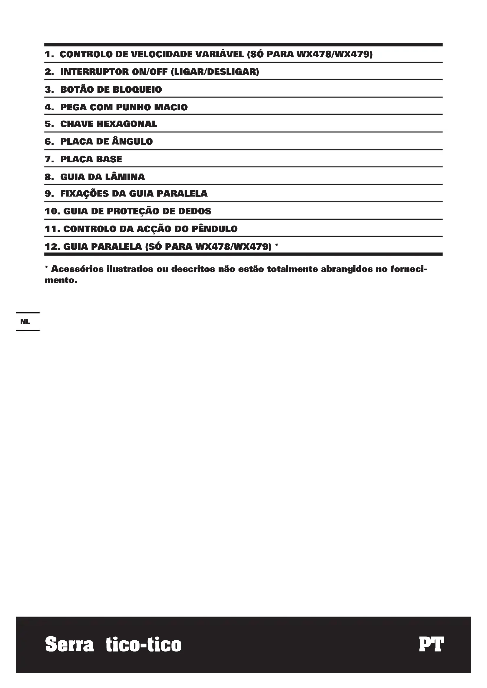 O valor total declarado da vibração poderá ser utilizado para comparar uma ferramenta com outra e poderá também ser utilizado numa avaliação preliminar de exposição. AVISO: Os valores de emissão de vibração durante a utilização da ferramenta podem divergir dos valores declarados, dependendo da forma como a ferramenta é utilizada, dependendo dos exemplos seguintes e de outros modos de utilização: O modo como a ferramenta é utilizada, os materiais a cortar ou perfurar. A ferramenta estar em boas condições e bem conservada. A utilização do acessório correcto para a ferramenta e a garantia de que está afiada e em boas condições. A firmeza com que se segura nas pegas e se quaisquer acessórios vibratórios são utilizados Se a ferramenta é utilizada para o objectivo para a qual foi concebida e segundo as instruções. Esta ferramenta pode causar síndrome de vibração mão-braço, se não for adequadamente utilizada. AVISO: Para ser preciso, uma estimativa do nível de exposição nas condições actuais de utilização devem ter em conta todas as partes do ciclo de operação, como tempos em que a ferramenta está desligada e quando está em funcionamento, mas inactiva, ou seja, não realizando o seu trabalho. Isto poderá reduzir significativamente o nível de exposição durante o período total de trabalho. Como minimizar o seu risco de Utilize SEMPRE formões, brocas e lâminas afiadas. Mantenha esta ferramenta de acordo com as instruções e bem lubrificada (quando aplicável) Se a ferramenta for utilizada regularmente, invista em acessórios anti-vibração. Evite utilizar ferramentas a temperaturas de 100C ou inferior. Planeie o seu horário de trabalho de forma a distribuir a utilização de ferramentas de alta vibra- ção ao longo de vários dias. ACESSÓRIOS WX477 WX478 WX479 Chave hexagonal 1 1 1 Lâmina de corte de metal 1 1 1 Lâmina de corte de madeira 1 1 1 Lâmina de corte de alumínio 1 1 1 Guia paralela / 1 1 Adaptador de extracção de poeiras / 1 1 Recomendamos-lhe que compre todos os acessórios no fornecedor onde tenha adquirido a ferramenta. Utilize acessórios de boa qualidade e de marca conhecida. Escolha os acessórios de acordo com o trabalho que tenciona executar. Para mais pormenores, consulte a embalagem destes. Os comerciais também pode ajudar e aconselhar.Serra tico-tico PT