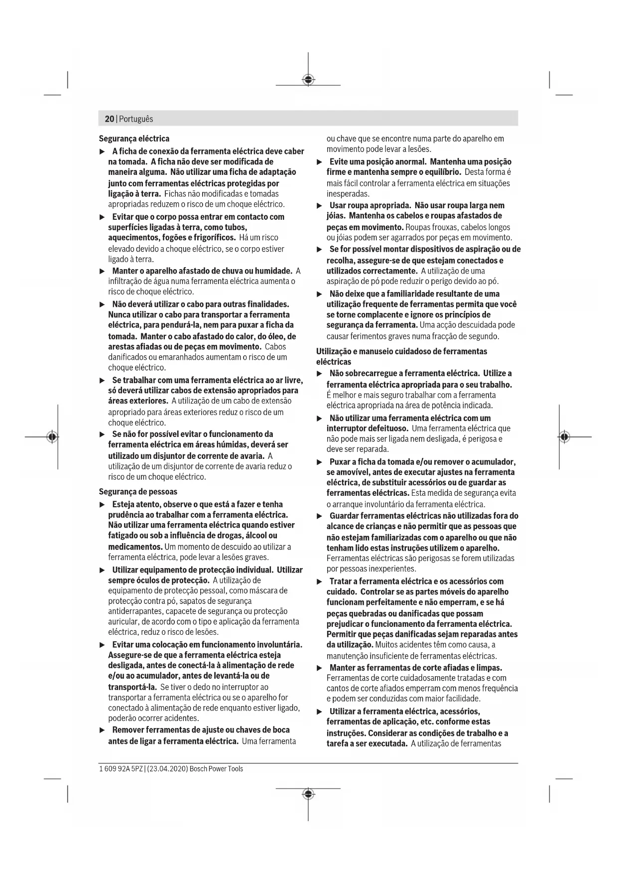 Tel. : +221 33 849 01 01 Fax : +221 33 823 34 20 Élimination des déchets Les outils électroportatifs, ainsi que leurs accessoires et em- ballages, doivent pouvoir suivre chacun une voie de recy- clage appropriée. Ne jetez pas les outils électroportatifs avec les ordures ménagères! Português Instruções de segurança Instruções gerais de segurança para ferramentas eléctricas AVISO Devem ser lidas todas as indicações de segurança, instruções, ilustrações e especificações desta ferramenta eléctrica. O desrespeito das instruções apresentadas abaixo poderá resultar em choque eléctrico, incêndio e/ou ferimentos graves. Guarde bem todas as advertências e instruções para futura referência. O termo "ferramenta eléctrica" utilizado a seguir nas indicações de advertência, refere‑se a ferramentas eléctricas operadas com corrente de rede (com cabo de rede) e a ferramentas eléctricas operadas com acumulador (sem cabo de rede). Segurança da área de trabalho u Mantenha a sua área de trabalho sempre limpa e bem iluminada. Desordem ou áreas de trabalho insuficientemente iluminadas podem levar a acidentes. u Não trabalhar com a ferramenta eléctrica em áreas com risco de explosão, nas quais se encontrem líquidos, gases ou pós inflamáveis. Ferramentas eléctricas produzem faíscas, que podem inflamar pós ou vapores. u Manter crianças e outras pessoas afastadas da ferramenta eléctrica durante a utilização. No caso de distracção é possível que perca o controlo sobre o aparelho. Bosch Power Tools 1 609 92A 5PZ | (23.04.2020)20 | Português Segurança eléctrica u A ficha de conexão da ferramenta eléctrica deve caber na tomada. A ficha não deve ser modificada de maneira alguma. Não utilizar uma ficha de adaptação junto com ferramentas eléctricas protegidas por ligação à terra. Fichas não modificadas e tomadas apropriadas reduzem o risco de um choque eléctrico. u Evitar que o corpo possa entrar em contacto com superfícies ligadas à terra, como tubos, aquecimentos, fogões e frigoríficos. Há um risco elevado devido a choque eléctrico, se o corpo estiver ligado à terra. u Manter o aparelho afastado de chuva ou humidade. A infiltração de água numa ferramenta eléctrica aumenta o risco de choque eléctrico. u Não deverá utilizar o cabo para outras finalidades. Nunca utilizar o cabo para transportar a ferramenta eléctrica, para pendurá‑la, nem para puxar a ficha da tomada. Manter o cabo afastado do calor, do óleo, de arestas afiadas ou de peças em movimento. Cabos danificados ou emaranhados aumentam o risco de um choque eléctrico. u Se trabalhar com uma ferramenta eléctrica ao ar livre, só deverá utilizar cabos de extensão apropriados para áreas exteriores. A utilização de um cabo de extensão apropriado para áreas exteriores reduz o risco de um choque eléctrico. u Se não for possível evitar o funcionamento da ferramenta eléctrica em áreas húmidas, deverá ser utilizado um disjuntor de corrente de avaria. A utilização de um disjuntor de corrente de avaria reduz o risco de um choque eléctrico. Segurança de pessoas u Esteja atento, observe o que está a fazer e tenha prudência ao trabalhar com a ferramenta eléctrica. Não utilizar uma ferramenta eléctrica quando estiver fatigado ou sob a influência de drogas, álcool ou medicamentos. Um momento de descuido ao utilizar a ferramenta eléctrica, pode levar a lesões graves. u Utilizar equipamento de protecção individual. Utilizar sempre óculos de protecção. A utilização de equipamento de protecção pessoal, como máscara de protecção contra pó, sapatos de segurança antiderrapantes, capacete de segurança ou protecção auricular, de acordo com o tipo e aplicação da ferramenta eléctrica, reduz o risco de lesões. u Evitar uma colocação em funcionamento involuntária. Assegure‑se de que a ferramenta eléctrica esteja desligada, antes de conectá‑la à alimentação de rede e/ou ao acumulador, antes de levantá‑la ou de transportá‑la. Se tiver o dedo no interruptor ao transportar a ferramenta eléctrica ou se o aparelho for conectado à alimentação de rede enquanto estiver ligado, poderão ocorrer acidentes. u Remover ferramentas de ajuste ou chaves de boca antes de ligar a ferramenta eléctrica. Uma ferramenta ou chave que se encontre numa parte do aparelho em movimento pode levar a lesões. u Evite uma posição anormal. Mantenha uma posição firme e mantenha sempre o equilíbrio. Desta forma é mais fácil controlar a ferramenta eléctrica em situações inesperadas. u Usar roupa apropriada. Não usar roupa larga nem jóias. Mantenha os cabelos e roupas afastados de peças em movimento. Roupas frouxas, cabelos longos ou jóias podem ser agarrados por peças em movimento. u Se for possível montar dispositivos de aspiração ou de recolha, assegure‑se de que estejam conectados e utilizados correctamente. A utilização de uma aspiração de pó pode reduzir o perigo devido ao pó. u Não deixe que a familiaridade resultante de uma utilização frequente de ferramentas permita que você se torne complacente e ignore os princípios de segurança da ferramenta. Uma acção descuidada pode causar ferimentos graves numa fracção de segundo. Utilização e manuseio cuidadoso de ferramentas eléctricas u Não sobrecarregue a ferramenta eléctrica. Utilize a ferramenta eléctrica apropriada para o seu trabalho. É melhor e mais seguro trabalhar com a ferramenta eléctrica apropriada na área de potência indicada. u Não utilizar uma ferramenta eléctrica com um interruptor defeituoso. Uma ferramenta eléctrica que não pode mais ser ligada nem desligada, é perigosa e deve ser reparada. u Puxar a ficha da tomada e/ou remover o acumulador, se amovível, antes de executar ajustes na ferramenta eléctrica, de substituir acessórios ou de guardar as ferramentas eléctricas. Esta medida de segurança evita o arranque involuntário da ferramenta