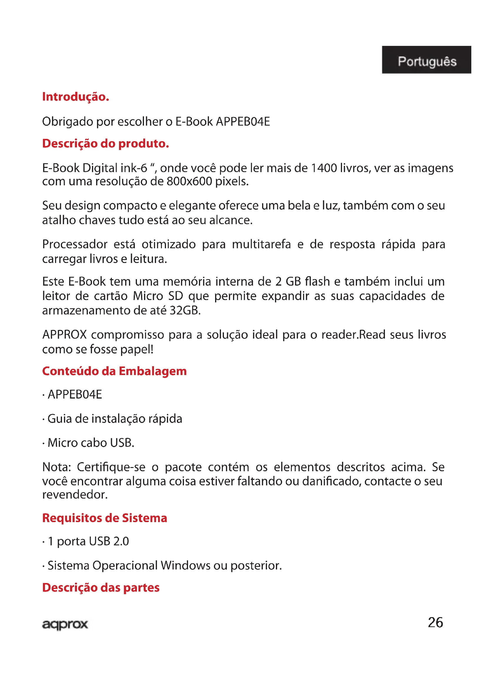 Baixe as instruções para o seu Leitor eletrônico em formato PDF gratuitamente! Encontre o seu manual APPEB04E - Approx e retome o controlo do seu dispositivo eletrónico. Nesta página estão publicados todos os documentos necessários para a utilização do seu dispositivo. APPEB04E da marca Approx.