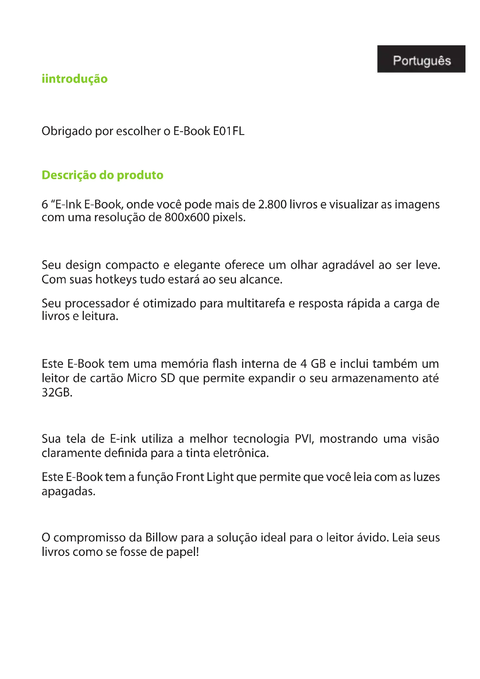 Z menu głównego wybierz Instrukcja obsługi i naciśnij klawisz Enter. Instrukcja eBook otworzy Wsparcie techniczne Aby uzyskać więcej informacji o tym produkcie można znaleźć na naszej części Pomoc na naszej stronie internetowej www.billowtechnology.com lub wysłać e-mail do Support@billowtechnology.comiintrodução Obrigado por escolher o E-Book E01FL Descrição do produto 6 “E-Ink E-Book, onde você pode mais de 2.800 livros e visualizar as imagens com uma resolução de 800x600 pixels. Seu design compacto e elegante oferece um olhar agradável ao ser leve. Com suas hotkeys tudo estará ao seu alcance. Seu processador é otimizado para multitarefa e resposta rápida a carga de livros e leitura. Este E-Book tem uma memória ash interna de 4 GB e inclui também um leitor de cartão Micro SD que permite expandir o seu armazenamento até 32GB. Sua tela de E-ink utiliza a melhor tecnologia PVI, mostrando uma visão claramente denida para a tinta eletrônica. Este E-Book tem a função Front Light que permite que você leia com as luzes apagadas. O compromisso da Billow para a solução ideal para o leitor ávido. Leia seus livros como se fosse de papel!Conteúdo da embalagem -E01FL -Guia rápido de instalação -Mini cabo USB Nota: Certique-se de que o pacote contém os itens descritos acima. Se você encontrar algum item estiver faltando ou danicado, entre em contato com o seu representante. Requisitos do sistema -1 Porta USB 2.0 -Sistema Operacional Windows Descrição Parts