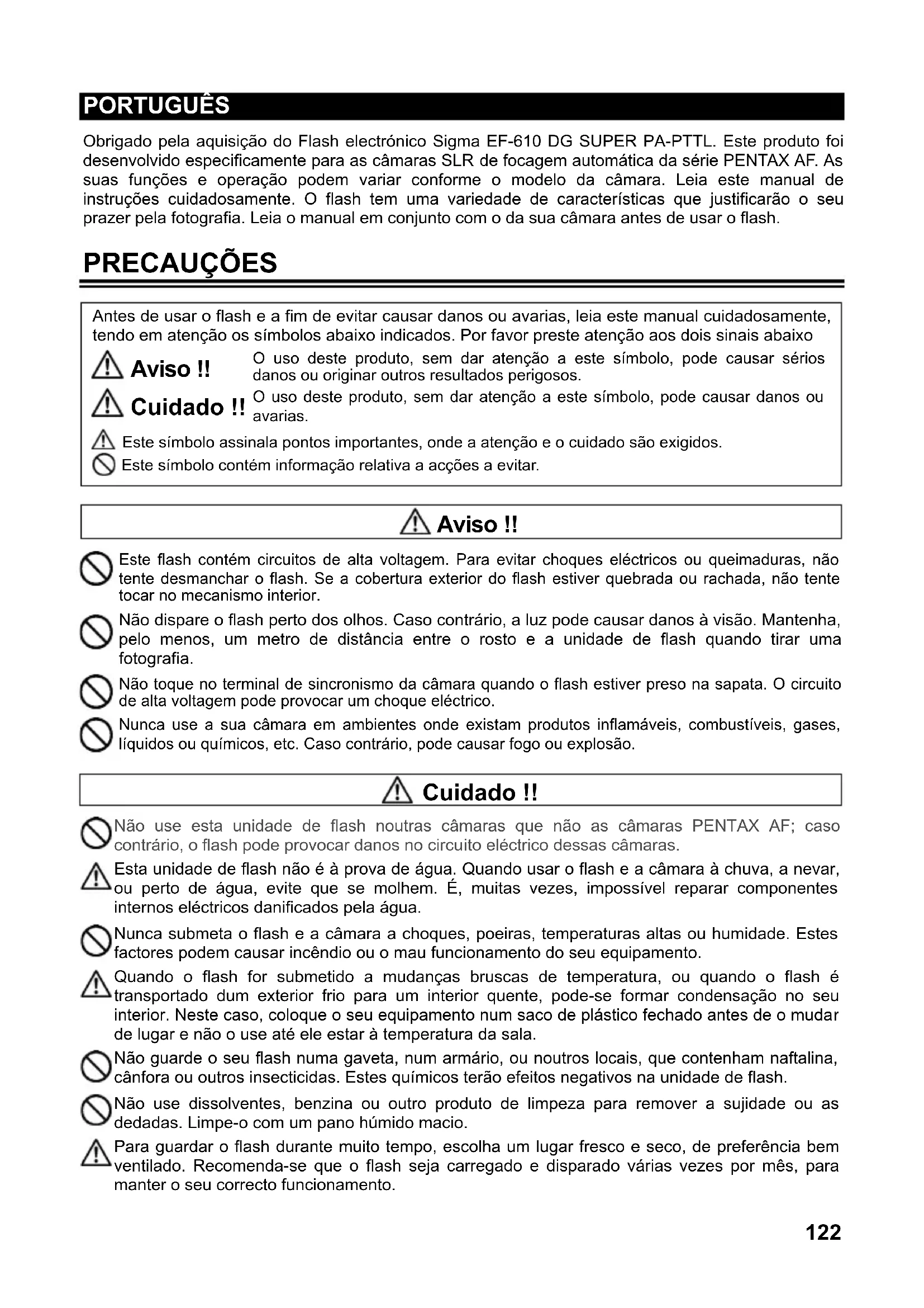160 вспышек (Ni-Cd, никель-металл-гидридные аккумуляторы) ДЛИТЕЛЬНОСТЬ ВСПЫШКИ: около 1/700 сек (для полной мощности) УГОЛ ОХВАТА ВСПЫШКОЙ: 24мм–105мм с управлением мотором (17мм для встроенной широкоугольной панели) АВТОМАТАЧЕСКОЕ ВЫКЛЮЧЕНИЕ ПИТАНИЯ: Установлено на вспышке ВЕС: 330 г ГАБАРИТЫ: 77 мм х 139 мм х 117 мм.122 PORTUGUÊS Obrigado pela aquisição do Flash electrónico Sigma EF-610 DG SUPER PA-PTTL. Este produto foi desenvolvido especificamente para as câmaras SLR de focagem automática da série PENTAX AF. As suas funções e operação podem variar conforme o modelo da câmara. Leia este manual de instruções cuidadosamente. O flash tem uma variedade de características que justificarão o seu prazer pela fotografia. Leia o manual em conjunto com o da sua câmara antes de usar o flash. PRECAUÇÕES Antes de usar o flash e a fim de evitar causar danos ou avarias, leia este manual cuidadosamente, tendo em atenção os símbolos abaixo indicados. Por favor preste atenção aos dois sinais abaixo Aviso !! Cuidado !! Este símbolo assinala pontos importantes, onde a atenção e o cuidado são exigidos. Este símbolo contém informação relativa a acções a evitar. O uso deste produto, sem dar atenção a este símbolo, pode causar sériosdanos ou originar outros resultados perigosos. O uso deste produto, sem dar atenção a este símbolo, pode causar danos ou avarias. Cuidado !! Não use esta unidade de flash noutras câmaras que não as câmaras PENTAX AF; caso contrário, o flash pode provocar danos no circuito eléctrico dessas câmaras. Esta unidade de flash não é à prova de água. Quando usar o flash e a câmara à chuva, a nevar,ou perto de água, evite que se molhem. É, muitas vezes, impossível reparar componentesinternos eléctricos danificados pela água. Nunca submeta o flash e a câmara a choques, poeiras, temperaturas altas ou humidade. Estesfactores podem causar incêndio ou o mau funcionamento do seu equipamento. Quando o flash for submetido a mudanças bruscas de temperatura, ou quando o flash étransportado dum exterior frio para um interior quente, pode-se formar condensação no seuinterior. Neste caso, coloque o seu equipamento num saco de plástico fechado antes de o muda