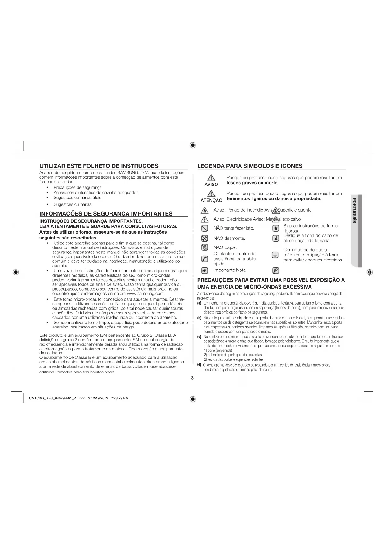Baixe as instruções para o seu Micro-ondas em formato PDF gratuitamente! Encontre o seu manual CM1919A - SAMSUNG e retome o controlo do seu dispositivo eletrónico. Nesta página estão publicados todos os documentos necessários para a utilização do seu dispositivo. CM1919A da marca SAMSUNG.