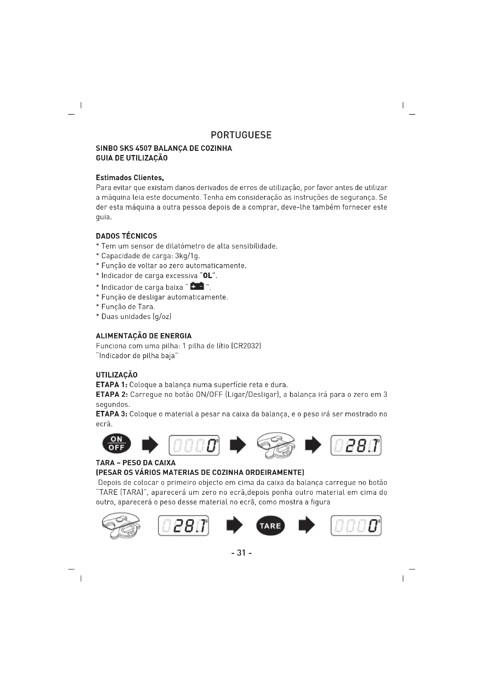 (PESAR OS VÁRIOS MATERIAS DE COZINHA ORDEIRAMENTE) Depois de colocar o primeiro objecto em cima da caixa da balança carregue no botão “TARE (TARA)”, aparecerá um zero no ecrã,depois ponha outro material em cima do outro, aparecerá o peso desse material no ecrã, como mostra a figura- 32 - DESLIGAR Depois de pesar tudo pode desligar a balança de duas formas, a primeira opção é carregar no botão “ON/OFF” (ligar/desligar) a segunda opção é esperar 30 segundos.