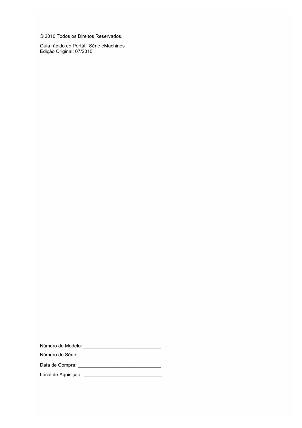 Español Notificacion Regulatoria Adicional [Argentina] El portatil Acer viene con los modulos de telecomunicaciones aprobados ya incorporados para su conexion a la red. El numero de modelo y numero de homologacion especifico para estos modelos se refieren a continuacion. [Modem] [Bluetooth] [802.11AGN] [802.11ABG] [802.11BG] [Brasil] Noticia adicional de regulamento Anatel Os componentes de telecomunicacao usados nos notebooks Acer em Portugues sao homologados atendendo a requisicao da Agencia Nacional de Telecomunicacoes Anatel, conforme referencia abaixo: [Modem] [Bluetooth] Modelo: RD02-D330 CNC 54-4512Modelo: Delphi_D40 CNC 53-4581Modelo: Delphi_D40 (AM5) CNC 54-5681Modelo: BCM92045NMD CNC 16-4062Modelo: 4965AGN CNC C-5421Modelo: BCM94321MC CNC C-5225Modelo: 512AN_MMW CNC C-6399Modelo: 533AN_MMW CNC C-6385Modelo: 4965AG_ CNC C-5424Modelo: WM3945ABG CNC C-4531Modelo: AR5BXB6 CNC C-4340Modelo: BCM94311MCG CNC C-4250Modelo: AR5BXB63 CNC C-5448Modelo: BCM94312MCG CNC C-5871Modelo: RD02-D3301406-05-1675Modelo: Delphi_D400455-06-2565Modelo:BCM92045NMD0578-05-186912 Español [802.11AGN] [802.11BGN] [802.11ABG] [802.11BG] Modelo: 4965AGN 0578-07-2198 Modelo: BCM94321MC 1761-06-1869 Modelo: 512AN_MMW 0807-08-2198 Modelo: 512AN_HMW 0800-08-2198 Modelo: 533AN_MMW 0809-08-2198 Modelo: 533AN_HMW 0812-08-2198 Modelo: AR5B91 1182-08-3987 Modelo: 4965AG_ 0350-07-2198 Modelo: WM3945ABG 0151-06-2198 Modelo: AR5BXB6 1188-05-2634 Modelo: BCM94311MCG 0979-05-1869 Modelo: AR5BXB63 1188-05-2634 Modelo: BCM94312MCG 1558-07-1869Portátil Série eMachines Guia rápidoNúmero de Modelo: _____________________________ Número de Série: ______________________________ Data de Compra: _______________________________ Local de Aquisição: _____________________________ © 2010 Todos os Direitos Reservados. Guia rápido do Portátil Série eMachines Edição Original: 07/20103 Primeiro que tudo Gostaríamos de lhe agradecer por ter escolhido um computador portátil eMachines para preencher as suas necessidades de computador móvel. Os seus manuais Para o ajudar a usar o seu computador portátil eMachines, preparámos uma série de manuais: Antes de mais, o cartaz de configuração ajuda-o a iniciar e a configurar o seu computador. O Manual Genérico eMachines impresso contém informações úteis que se aplicam a todos os modelos da gama de produtos eMachines. Abrange tópicos básicos como a utilização do teclado, áudio, etc. Pedimos a sua compreensão para o facto de, pela sua natureza, o Manual Genérico do Utilizador eMachines referem-se ocasionalmente a funções ou funcionalidades apenas aplicáveis a determinados modelos, mas não necessariamente ao modelo específico que adquiriu. Tais situações estão assinaladas no texto com expressões como "apenas em certos modelos". Este Guia rápido apresenta as características e funções básicas do seu novo computador. Para mais informações sobre como pode o seu computador ajudá-lo a ser mais produtivo, consulte o Manual Genérico do Utilizador eMachines, que contém informações detalhadas sobre assuntos como utilitários de sistema, recuperação de dados, opções de expansão e resolução de problemas. Além disso, contém a informação da garantia e as regulamentações gerais e notas de segurança para o seu computador portátil. Está disponível no formato PDF (Portable Document Format) e vem já instalado no seu computador. Siga estes passos para a ele aceder: 1 Clique em Iniciar > Todos os programas > Documentação eMachines. 2 Clique em Manual Genérico do Utilizador eMachines. Nota: É necessário instalar o Adobe Reader para visualizar o ficheiro. Se o Adobe Reader não estiver instalado no seu computador, ao clicar em Manual Genérico do Utilizador eMachines é executado o programa de instalação do Acrobat Reader. Siga as instruções do ecrã para finalizar a instalação. Para obter instruções sobre como utilizar o Adobe Reader, vá ao menu Ajuda e Suporte.4 Português Português Visita guiada ao seu computador portátil eMachines Após montar o computador tal como indicado na ilustração do cartaz, deixe-nos mostrar-lhe o seu novo computador portátil eMachines. Vista de cima