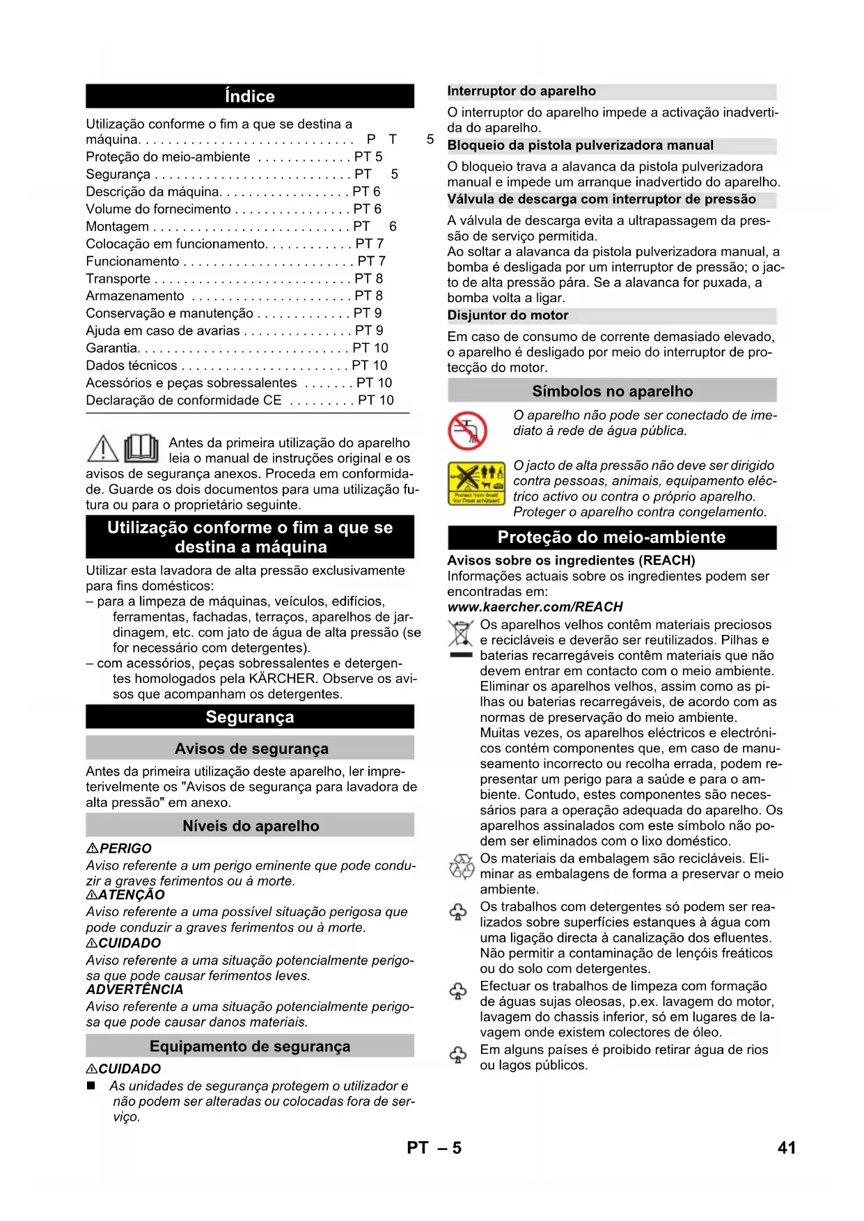 92 dB(A) Sujeto a modificaciones técnicas. Accesorios y piezas de repuesto Declaración de conformidad CE Producto: Limpiadora a alta presión Modelo: 1.324-xxx Directivas comunitarias aplicables 2000/14/CE 2014/30/UE 2006/42/CE (+2009/127/CE) 2011/65/UE Normas armonizadas aplicadas EN 50581 EN 55014–1: 2006+A1: 2009+A2: 2011 EN 55014–2: 1997+A1: 2001+A2: 2008 EN 60335–1 EN 60335–2–79 EN 61000–3–2: 2014 EN 61000–3–3: 2013 EN 62233: 2008 Procedimiento de evaluación de la conformidad aplicado 2000/14/CE: Anexo V Nivel de potencia acústica dB(A) Medido: 89 Garantizado: 92 Winnenden, 2016/01/01 CEO Head of Approbation 40 ES– 5 Antes da primeira utilização do aparelho leia o manual de instruções original e os avisos de segurança anexos. Proceda em conformida- de. Guarde os dois documentos para uma utilização fu- tura ou para o proprietário seguinte. Utilizar esta lavadora de alta pressão exclusivamente para fins domésticos: – para a limpeza de máquinas, veículos, edifícios, ferramentas, fachadas, terraços, aparelhos de jar- dinagem, etc. com jato de água de alta pressão (se for necessário com detergentes). – com acessórios, peças sobressalentes e detergen- tes homologados pela KÄRCHER. Observe os avi- sos que acompanham os detergentes. Antes da primeira utilização deste aparelho, ler impre- terivelmente os "Avisos de segurança para lavadora de alta pressão" em anexo. PERIGO Aviso referente a um perigo eminente que pode condu- zir a graves ferimentos ou à morte. 몇 ATENÇÃO Aviso referente a uma possível situação perigosa que pode conduzir a graves ferimentos ou à morte. 몇 CUIDADO Aviso referente a uma situação potencialmente perigo- sa que pode causar ferimentos leves. ADVERTÊNCIA Aviso referente a uma situação potencialmente perigo- sa que pode causar danos materiais. 몇 CUIDADO As unidades de segurança protegem o utilizador e não podem ser alteradas ou colocadas fora de ser- viço. O interruptor do aparelho impede a activação inadverti- da do aparelho. O bloqueio trava a alavanca da pistola pulverizadora manual e impede um arranque inadvertido do aparelho. A válvula de descarga evita a ultrapassagem da pres- são de serviço permitida. Ao soltar a alavanca da pistola pulverizadora manual, a bomba é desligada por um interruptor de pressão; o jac- to de alta pressão pára. Se a alavanca for puxada, a bomba volta a ligar. Em caso de consumo de corrente demasiado elevado, o aparelho é desligado por meio do interruptor de pro- tecção do motor. Avisos sobre os ingredientes (REACH) Informações actuais sobre os ingredientes podem ser encontradas em: www.kaercher.com/REACH Índice Utilização conforme o fim a que se destina a máquina. . . . . . . . . . . . . . . . . . . . . . . . . . . . .PT 5 Proteção do meio-ambiente . . . . . . . . . . . . . PT 5 Segurança . . . . . . . . . . . . . . . . . . . . . . . . . . . PT5 Descrição da máquina. . . . . . . . . . . . . . . . . . PT 6 Volume do fornecimento . . . . . . . . . . . . . . . . PT 6 Montagem . . . . . . . . . . . . . . . . . . . . . . . . . . . PT6 Colocação em funcionamento. . . . . . . . . . . . PT 7 Funcionamento . . . . . . . . . . . . . . . . . . . . . . . PT 7 Transporte . . . . . . . . . . . . . . . . . . . . . . . . . . . PT 8 Armazenamento . . . . . . . . . . . . . . . . . . . . . . PT 8 Conservação e manutenção . . . . . . . . . . . . . PT 9 Ajuda em caso de avarias . . . . . . . . . . . . . . . PT 9 Garantia. . . . . . . . . . . . . . . . . . . . . . . . . . . . . PT 10 Dados técnicos . . . . . . . . . . . . . . . . . . . . . . . PT 10 Acessórios e peças sobressalentes . . . . . . . PT 10 Declaração de conformidade CE . . . . . . . . . PT 10 Utilização conforme o fim a que se destina a máquina Segurança Avisos de segurança Níveis do aparelho Equipamento de segurança Interruptor do aparelho Bloqueio da pistola pulverizadora manual Válvula de descarga com interruptor de pressão Disjuntor do motor Símbolos no aparelho O aparelho não pode ser conectado de ime- diato à rede de água pública. O jacto de alta pressão não deve ser dirigido contra pessoas, animais, equipamento eléc- trico activo ou contra o próprio aparelho. Proteger o aparelho contra congelamento. Proteção do meio-ambiente Os aparelhos velhos contêm materiais preciosos e recicláveis e deverão ser reutilizados. Pilhas e baterias recarregáveis contêm materiais que não devem entrar em contacto com o meio ambiente. Eliminar os aparelhos velhos, assim como as pi- lhas ou baterias recarregáveis, de acordo com as normas de preservação do meio ambiente. Muitas vezes, os aparelhos eléctricos e electróni- cos contém componentes que, em caso de manu- seamento incorrecto ou recolha errada, podem re- presentar um perigo para a saúde e para o am- biente. Contudo, estes componentes são neces- sários para a operação adequada do aparelho. Os aparelhos assinalados com este símbolo não po- dem ser eliminados com o lixo doméstico. Os materiais da embalagem são recicláveis. Eli- minar as embalagens de forma a preservar o meio ambiente. Os trabalhos com detergentes só podem ser rea- lizados sobre superfícies estanques à água com uma ligação directa à canalização dos efluentes. Não permitir a contaminação de lençóis freáticos ou do solo com detergentes. Efectuar os trabalhos de limpeza com formação de águas sujas oleosas, p.ex. lavagem do motor, lavagem do chassis inferior, só em lugares de la- vagem onde existem colectores de óleo. Em alguns países é proibido retirar água de rios ou lagos públicos. 41PT– 6 Neste manual de instruções é descrito o equipamento completo. Consoante o modelo, existem diferenças no volume de fornecimento (ver embalagem). Figuras, ver página desdobrável 4 1 Peça de acoplamento para ligação da água 2 Conexão de água com peneira incorporada 3 Mangueira de alta pressão 4 Guia da mangueira 5 Local de ar