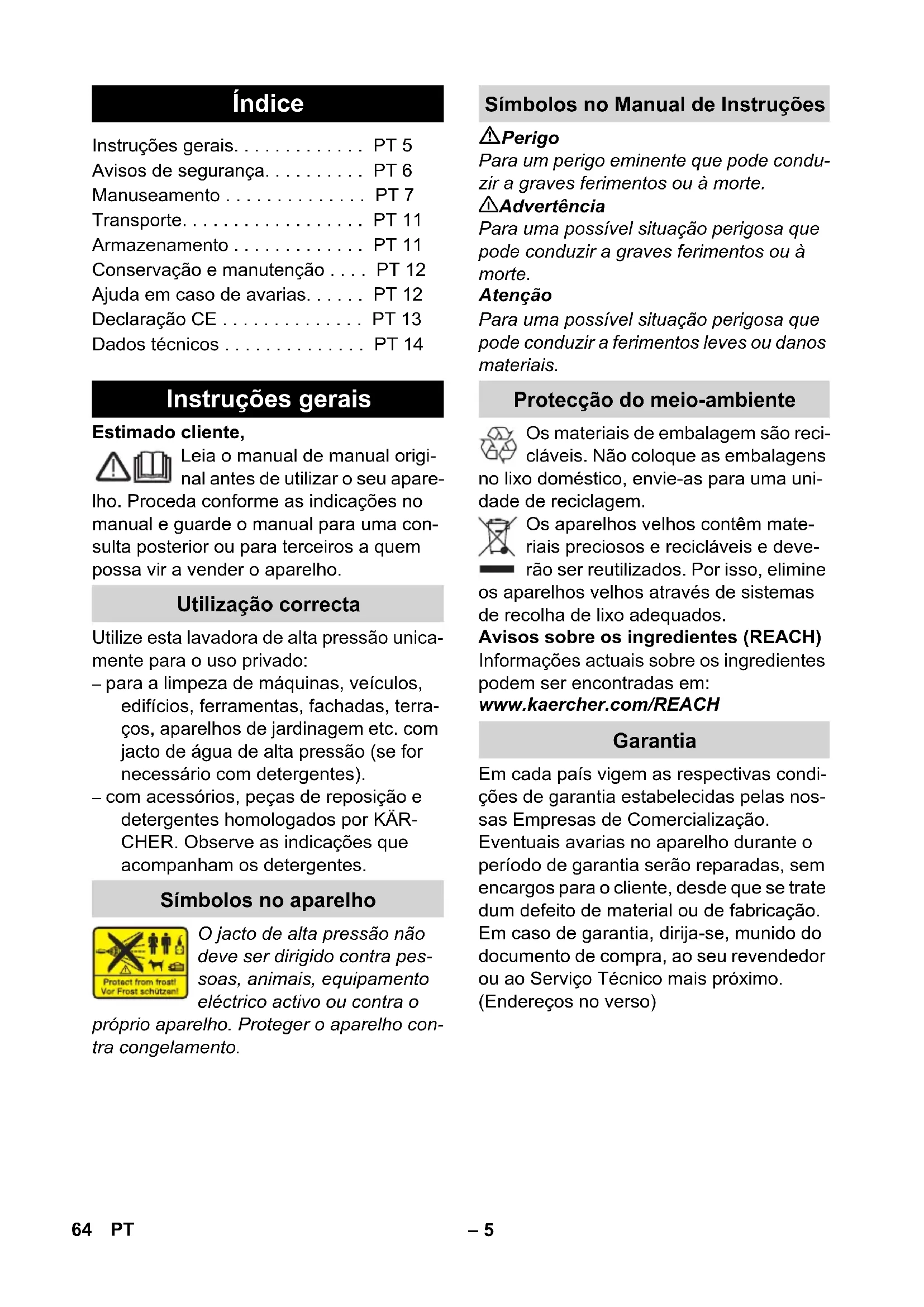 dB(A) 972 63ESPortuguês – 5 Estimado cliente, Leia o manual de manual origi- nal antes de utilizar o seu apare- lho. Proceda conforme as indicações no manual e guarde o manual para uma con- sulta posterior ou para terceiros a quem possa vir a vender o aparelho. Utilize esta lavadora de alta pressão unica- mente para o uso privado: – para a limpeza de máquinas, veículos, edifícios, ferramentas, fachadas, terra- ços, aparelhos de jardinagem etc. com jacto de água de alta pressão (se for necessário com detergentes). – com acessórios, peças de reposição e detergentes homologados por KÄR- CHER. Observe as indicações que acompanham os detergentes. O jacto de alta pressão não deve ser dirigido contra pes- soas, animais, equipamento eléctrico activo ou contra o próprio aparelho. Proteger o aparelho con- tra congelamento. Perigo Para um perigo eminente que pode condu- zir a graves ferimentos ou à morte. 몇 Advertência Para uma possível situação perigosa que pode conduzir a graves ferimentos ou à morte. Atenção Para uma possível situação perigosa que pode conduzir a ferimentos leves ou danos materiais. Os materiais de embalagem são reci- cláveis. Não coloque as embalagens no lixo doméstico, envie-as para uma uni- dade de reciclagem. Os aparelhos velhos contêm mate- riais preciosos e recicláveis e deve- rão ser reutilizados. Por isso, elimine os aparelhos velhos através de sistemas de recolha de lixo adequados. Avisos sobre os ingredientes (REACH) Informações actuais sobre os ingredientes podem ser encontradas em: www.kaercher.com/REACH Em cada país vigem as respectivas condi- ções de garantia estabelecidas pelas nos- sas Empresas de Comercialização. Eventuais avarias no aparelho durante o período de garantia serão reparadas, sem encargos para o cliente, desde que se trate dum defeito de material ou de fabricação. Em caso de garantia, dirija-se, munido do documento de compra, ao seu revendedor ou ao Serviço Técnico mais próximo. (Endereços no verso) Índice Instruções gerais. . . . . . . . . . . . . PT 5 Avisos de segurança. . . . . . . . . . PT 6 Manuseamento . . . . . . . . . . . . . . PT 7 Transporte. . . . . . . . . . . . . . . . . . PT 11 Armazenamento . . . . . . . . . . . . . PT 11 Conservação e manutenção . . . . PT 12 Ajuda em caso de avarias. . . . . . PT 12 Declaração CE . . . . . . . . . . . . . . PT 13 Dados técnicos . . . . . . . . . . . . . . PT 14 Instruções gerais Utilização correcta Símbolos no aparelho Símbolos no Manual de Instruções Protecção do meio-ambiente Garantia 64 PT– 6 Perigo Nunca tocar na ficha de rede e na toma- da com as mãos molhadas. O aparelho não deve ser colocado em funcionamento se o cabo de ligação à rede ou partes importantes do aparelho como, p. ex., dispositivos de seguran- ça, mangueiras de alta pressão ou pis- tola de injecção estiverem danificadas. Antes de qualquer utilização do apare- lho, verificar se o cabo de ligação à rede e a ficha de rede não apresentam quaisquer danos. O cabo de ligação à rede danificado tem que ser imediata- mente substituído pela assistência téc- nica ou por um electricista autorizado. Verificar a mangueira de alta pressão a respeito de danos antes de cada colo- cação em funcionamento. Substituir imediatamente uma mangueira de alta pressão danificada. É proibido pôr o aparelho em funciona- mento em áreas com perigo de explo- são. Na utilização do aparelho em zonas de perigo (p. ex. bombas de gasolina), de- verão ser observadas as respectivas normas de segurança. Os jactos de alta pressão podem ser perigosos em caso de uso incorrecto. O jacto não deve ser dirigido contra pes- soas, animais, equipamento eléctrico activo ou contra o próprio aparelho. Não dirigir o jacto de alta pressão con- tra terceiros ou contra si próprio para a limpeza de roupa ou sapatos. Não projectar jactos de água contra ob- jectos, que contenham substâncias no- civas à saúde (p.ex. amianto). O jacto de alta pressão pode danificar pneus e as válvulas dos mesmos ou provocar até o seu rebentamento. O primeiro sinal de danos é a alteração da cor do pneu. Os pneus / válvulas dos pneus danificados podem causar le- sões mortais. Guardar pelo menos uma distância do jacto de 30 cm durante a limpeza de superfícies! Perigo de explosão! Não pulverizar líquidos inflamáveis. Nunca aspirar líquidos com teores de diluentes ou ácidos e dissolventes não diluídos! Trata-se de materiais como gasolina, diluentes de cores ou óleo combustível. A neblina de pulverização é altamente inflamável, explosiva e tó- xica. Não utilizar acetona, ácidos e dis- solventes não diluídos, dado que podem atacar os materiais utilizados no aparelho. 몇 Advertência Fichas e acoplamentos de um cabo de extensão têm que ser estanques à água e não podem estar na água. Os cabos de extensão não apropriados podem ser perigosos. Utilize ao ar livre unicamente cabos de extensão com uma secção transversal suficiente e de- vidamente homologados e marcados: