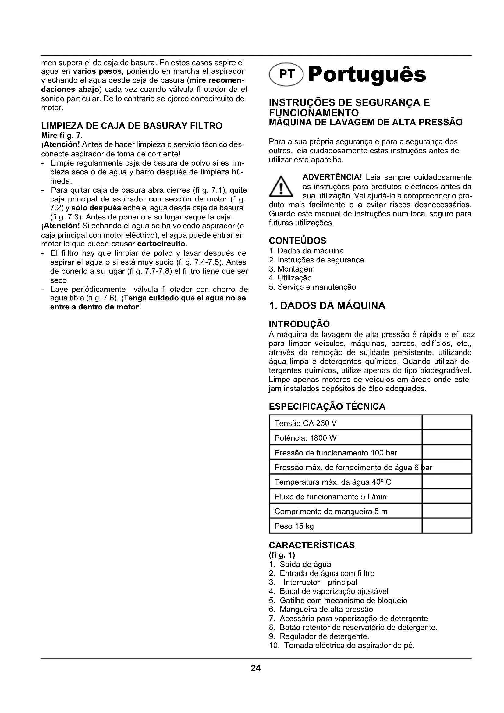 Italiano o bocal para cima (para evitar a saída do líquido da man- gueira), e, só depois disso, desligar o aspirador. Tenha cuidado especial quando a água se suga do depósi- to com o nível de água superior ao do aspirador ou quando o volume da água no depósito é maior do volume do reci- piente de lixo. Nesses casos aspire água em mais de uma vez, desligando o aspirador e esvaziando o recipiente de lixo (vide as instruções adiante) cada vez que a válvula de bóia começa a emitir o som característico. Caso contrá- rio, pode-se ocorrer curto-circuito do motor eléctrico. LIMPEZA DO RECIPIENTE DE LIXO E DO FILTRO Vide a g. 7. Atenção! Antes de começar a limpeza ou a manutenção, desligue o aspirador da rede eléctrica. - Quando usar o aspirador para a limpeza seca, regular- mente tire pó do recipiente de lixo; retire a água e a su- jeira do recipiente cada vez que faça a limpeza úmida. - Para extrair o recipiente de lixo, solte os ferrolhos de retenção (^ g. 7.1), tire o corpo do aspirador com o com- partimento do motor (^ g. 7.2) e, só depois de feitas essas operações, despeje água do recipiente de lixo (^ g. 7.3). Enxugue o recipiente de lixo antes de colocá- lo em seu lugar. Atenção! Se, despejando água do recipiente de lixo, virar o aspirador (ou seu corpo retirado) “de cabeça para baixo”, a água pode cair no motor eléctrico e provocar curto-cir- cuito. - Depois de sugada a água e se o ^ ltro estar muito sujo, limpe-o de pó e lave-o (^ g. 7.4 - 7.5). Antes de colocar o ^ ltro de novo (<*$. 7.7-7.8), enxugue-o. - Lave periodicamente a válvula de bóia com o jacto de água quente (vide ^ g. 7.6). Evite que água entre no motor.30 A norma di criteri di sicurezza essenziali dell’Unione Europea. Rischio di danni al materiale o di ferite ^ siche In caso di danni, tolga immediatamente la spina dalla linea principale Legga il manuale di istruzioni Indica il rischio di scosse