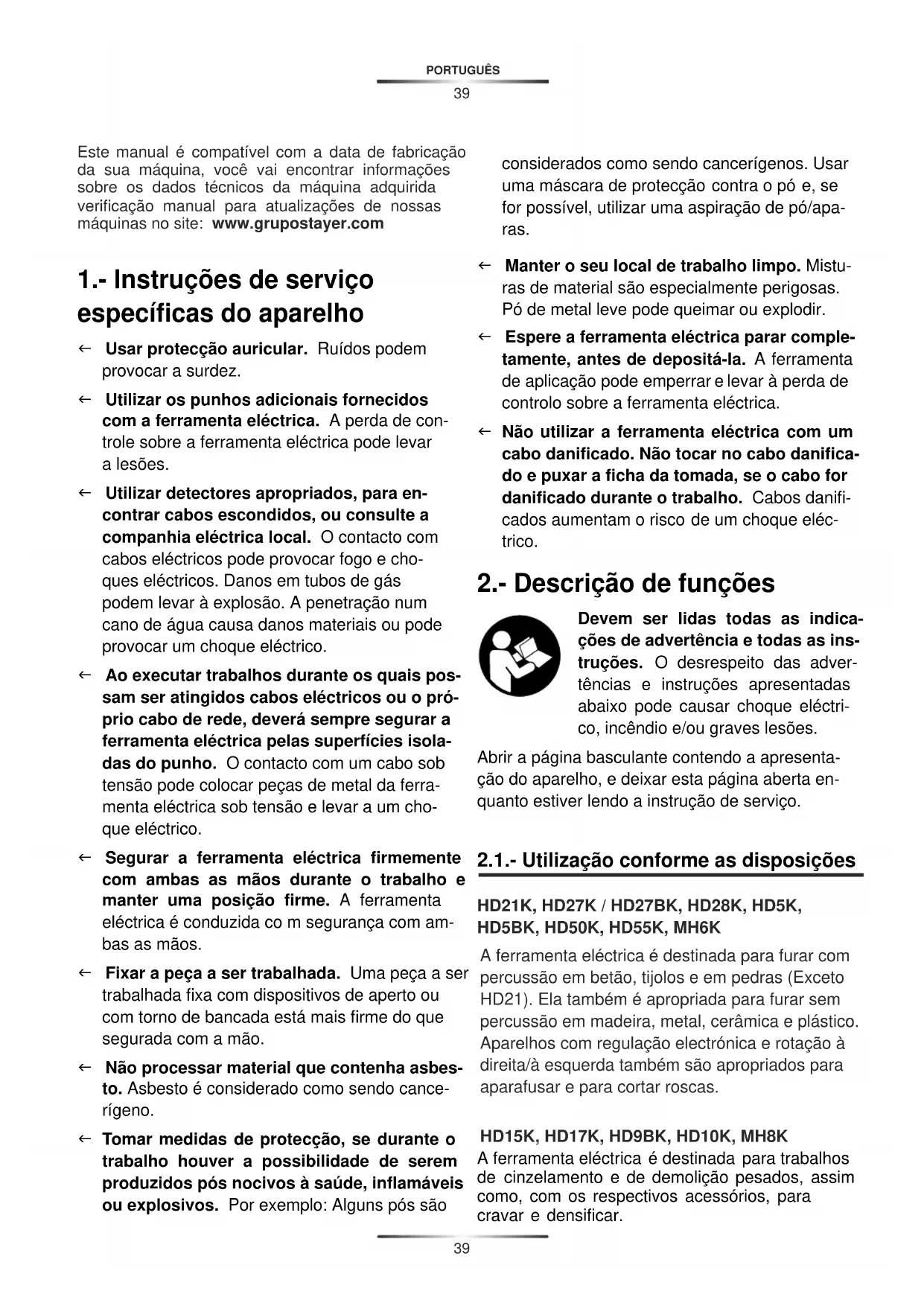 A ferramenta eletrica é destinada para furar com percussao em betao, tijolos e em pedras (Exceto HD21). Ela tambem é apropriada para furar sem percussao em madeira, metal, ceramica e plastico. Aparelhos com regulação electrónica e rotação à direita/à esquerda también são apropriados para aparafusar e paraURTAR ROSCAS.