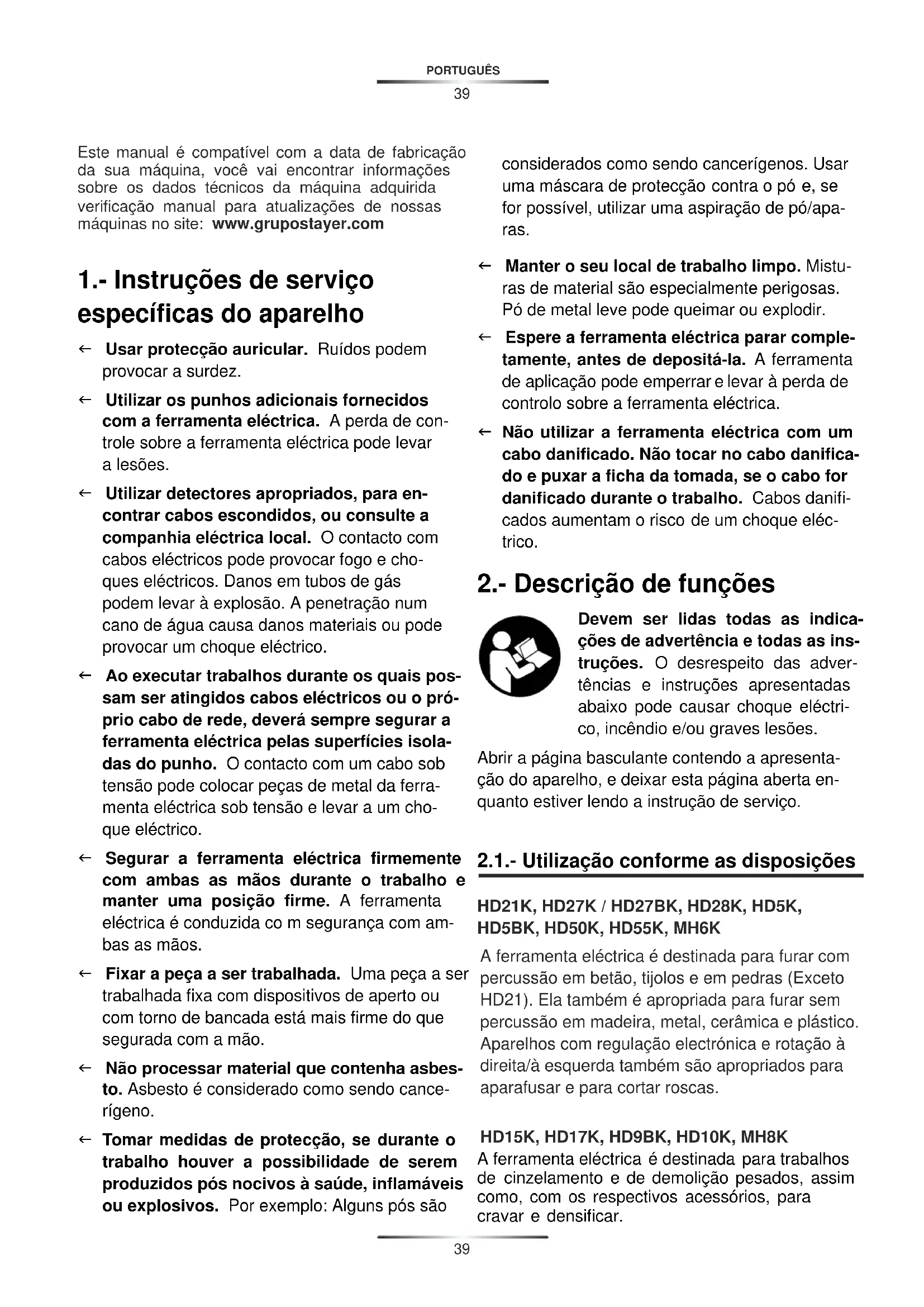 A ferramenta eléctrica é destinada para furar com percussão em betão, tijolos e em pedras (Exceto HD21). Ela também é apropriada para furar sem percussão em madeira, metal, cerâmica e plástico. Aparelhos com regulação electrónica e rotação à direita/à esquerda também são apropriados para aparafusar e para cortar roscas.