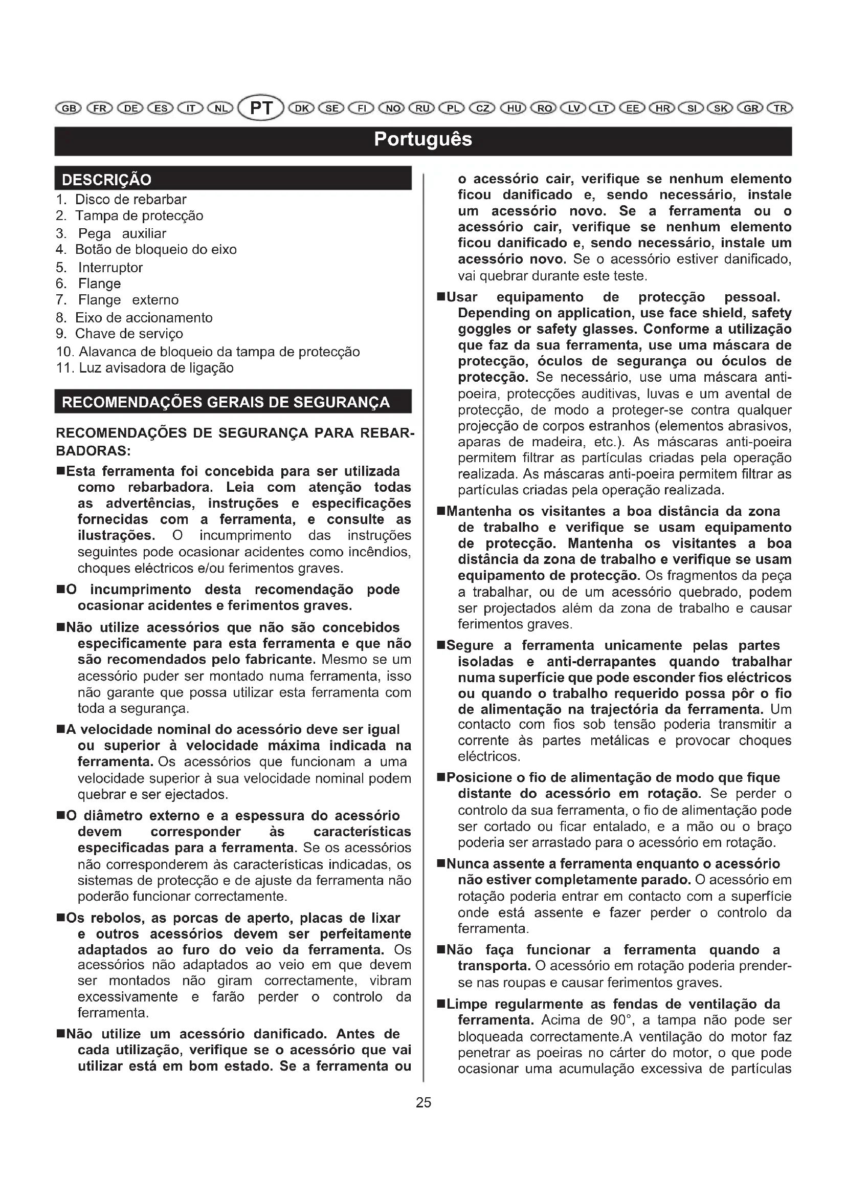 RECOMENDAÇÕES DE SEGURANÇA PARA REBAR- BADORAS: Esta ferramenta foi concebida para ser utilizada como rebarbadora. Leia com atenção todas as advertências, instruções e especificações fornecidas com a ferramenta, e consulte as ilustrações. O incumprimento das instruções seguintes pode ocasionar acidentes como incêndios, choques eléctricos e/ou ferimentos graves. O incumprimento desta recomendação pode ocasionar acidentes e ferimentos graves. Não utilize acessórios que não são concebidos especificamente para esta ferramenta e que não são recomendados pelo fabricante. Mesmo se um acessório puder ser montado numa ferramenta, isso não garante que possa utilizar esta ferramenta com toda a segurança. A velocidade nominal do acessório deve ser igual ou superior à velocidade máxima indicada na ferramenta. Os acessórios que funcionam a uma velocidade superior à sua velocidade nominal podem quebrar e ser ejectados. O diâmetro externo e a espessura do acessório devem corresponder às características especificadas para a ferramenta. Se os acessórios não corresponderem às características indicadas, os sistemas de protecção e de ajuste da ferramenta não poderão funcionar correctamente. Os rebolos, as porcas de aperto, placas de lixar e outros acessórios devem ser perfeitamente adaptados ao furo do veio da ferramenta. Os acessórios não adaptados ao veio em que devem ser montados não giram correctamente, vibram excessivamente e farão perder o controlo da ferramenta. Não utilize um acessório danificado. Antes de cada utilização, verifique se o acessório que vai utilizar está em bom estado. Se a ferramenta ou o acessório cair, verifique se nenhum elemento ficou danificado e, sendo necessário, instale um acessório novo. Se a ferramenta ou o acessório cair, verifique se nenhum elemento ficou danificado e, sendo necessário, instale um acessório novo. Se o acessório estiver danificado, vai quebrar durante este teste. Usar equipamento de protecção pessoal. Depending on application, use face shield, safety goggles or safety glasses. Conforme a utilização que faz da sua ferramenta, use uma máscara de protecção, óculos de segurança ou óculos de protecção. Se necessário, use uma máscara anti- poeira, protecções auditivas, luvas e um avental de protecção, de modo a proteger-se contra qualquer projecção de corpos estranhos (elementos abrasivos, aparas de madeira, etc.). As máscaras anti-poeira permitem filtrar as partículas criadas pela operação realizada. As máscaras anti-poeira permitem filtrar as partículas criadas pela operação realizada. Mantenha os visitantes a boa distância da zona de trabalho e verifique se usam equipamento de protecção. Mantenha os visitantes a boa distância da zona de trabalho e verifique se usam equipamento de protecção. Os fragmentos da peça a trabalhar, ou de um acessório quebrado, podem ser projectados além da zona de trabalho e causar ferimentos graves. Segure a ferramenta unicamente pelas partes isoladas e anti-derrapantes quando trabalhar numa superfície que pode esconder fios eléctricos ou quando o trabalho requerido possa pôr o fio de alimentação na trajectória da ferramenta. Um contacto com fios sob tensão poderia transmitir a corrente às partes metálicas e provocar choques eléctricos. Posicione o fio de alimentação de modo que fique distante do acessório em rotação. Se perder o controlo da sua ferramenta, o fio de alimentação pode ser cortado ou ficar entalado, e a mão ou o braço poderia ser arrastado para o acessório em rotação. Nunca assente a ferramenta enquanto o acessório não estiver completamente parado. O acessório em rotação poderia entrar em contacto com a superfície onde está assente e fazer perder o controlo da ferramenta. Não faça funcionar a ferramenta quando a transporta. O acessório em rotação poderia prender- se nas roupas e causar ferimentos graves. Limpe regularmente as fendas de ventilação da ferramenta. Acima de 90°, a tampa não pode ser bloqueada correctamente.A ventilação do motor faz penetrar as poeiras no cárter do motor, o que pode ocasionar uma acumulação excessiva de partículas26 Português