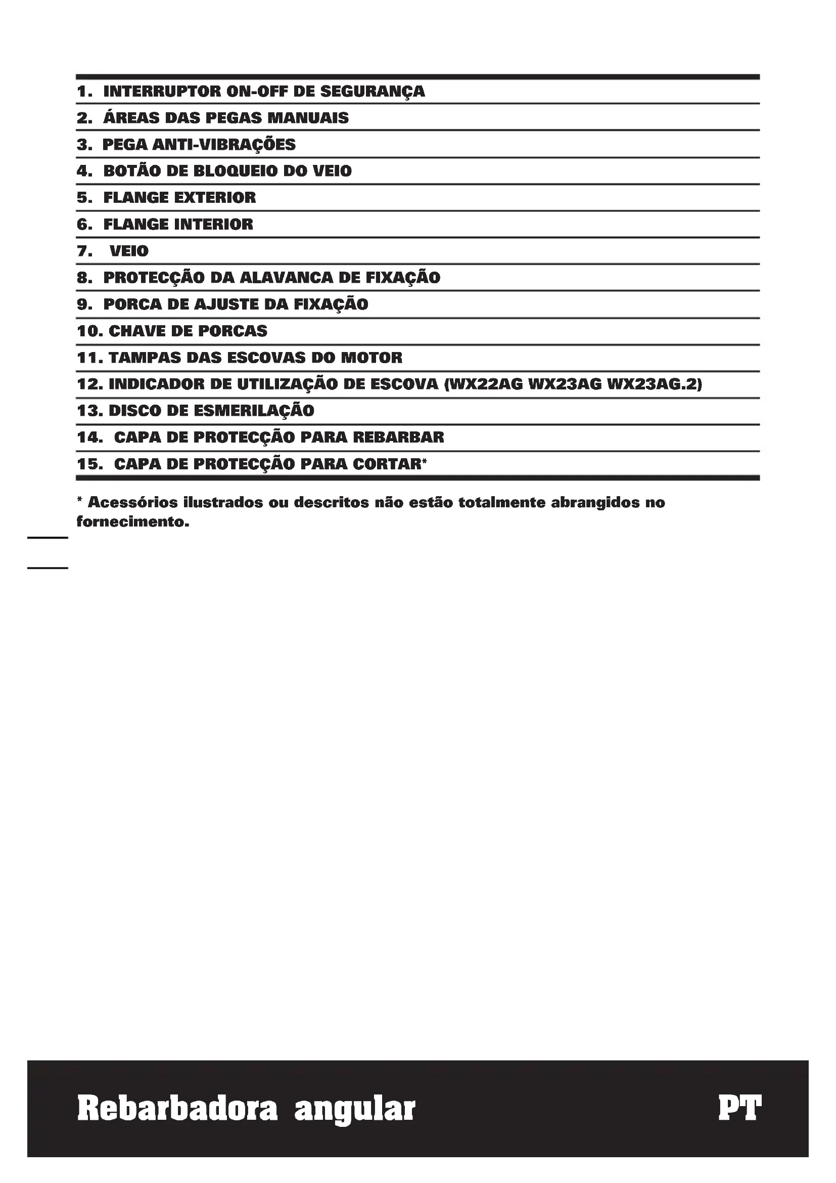 C ou inferior. Planeie o seu horário de trabalho de forma a distribuir a utilização de ferramentas de alta vibração ao longo de vários dias. ACESSÓRIOS Chave de porcas 1 Pega anti-vibrações 1 Disco de afiar de metal (WX22AG WX23AG WX23AG.1) 1 Recomendamos-lhe que compre todos os acessórios no fornecedor onde adquiriu a ferramenta. Utilize acessórios de boa qualidade e de uma marca conhecida. Para mais innformações, consulte as Sugestões de Trabalho neste manual ou a embalagem de acessórios. O pessoal do fornecedor também pode ajudar e aconselhar.Rebarbadora angular PT