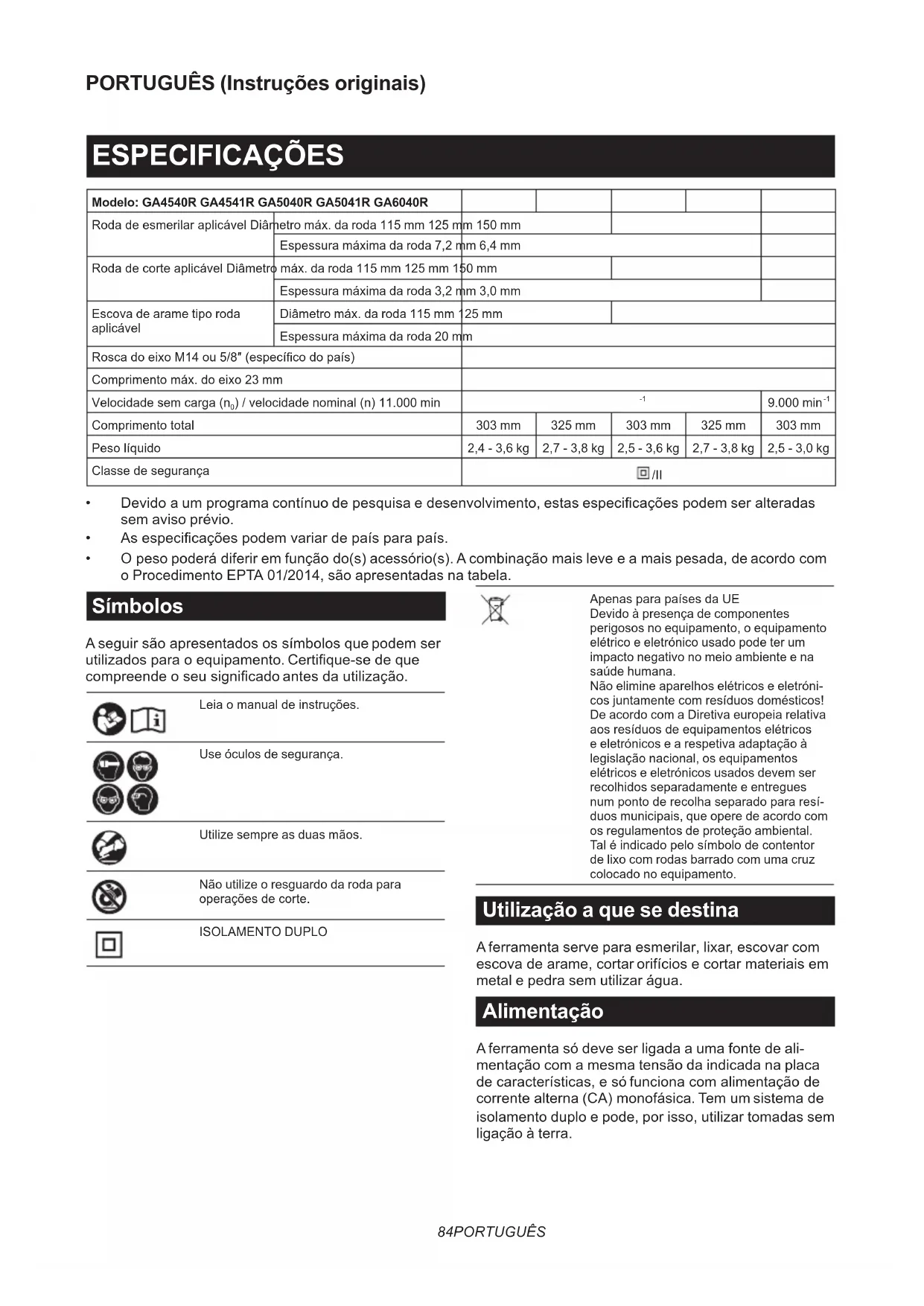 - O peso poderá diferir em função do(s) acessório(s). A combinação mais leve e a mais pesada, de acordo com o Procedimento EPTA 01/2014, são apresentadas na tabela. Símbolos A seguir são apresentados os símbolos que podem ser utilizados para o equipamento. Certique-se de que compreende o seu signicado antes da utilização. Leia o manual de instruções. Use óculos de segurança. Utilize sempre as duas mãos. Não utilize o resguardo da roda para operações de corte. ISOLAMENTO DUPLO Apenas para países da UE Devido à presença de componentes perigosos no equipamento, o equipamento elétrico e eletrónico usado pode ter um impacto negativo no meio ambiente e na saúde humana. Não elimine aparelhos elétricos e eletróni- cos juntamente com resíduos domésticos! De acordo com a Diretiva europeia relativa aos resíduos de equipamentos elétricos e eletrónicos e a respetiva adaptação à legislação nacional, os equipamentos elétricos e eletrónicos usados devem ser recolhidos separadamente e entregues num ponto de recolha separado para resí- duos municipais, que opere de acordo com os regulamentos de proteção ambiental. Tal é indicado pelo símbolo de contentor de lixo com rodas barrado com uma cruz colocado no equipamento. Utilização a que se destina A ferramenta serve para esmerilar, lixar, escovar com escova de arame, cortar orifícios e cortar materiais em metal e pedra sem utilizar água. Alimentação A ferramenta só deve ser ligada a uma fonte de ali- mentação com a mesma tensão da indicada na placa de características, e só funciona com alimentação de corrente alterna (CA) monofásica. Tem um sistema de isolamento duplo e pode, por isso, utilizar tomadas sem ligação à terra.85 PORTUGUÊS Ruído A característica do nível de ruído A determinado de acordo com a EN62841-2-3: Modelo Nível de pressão sonora (L
