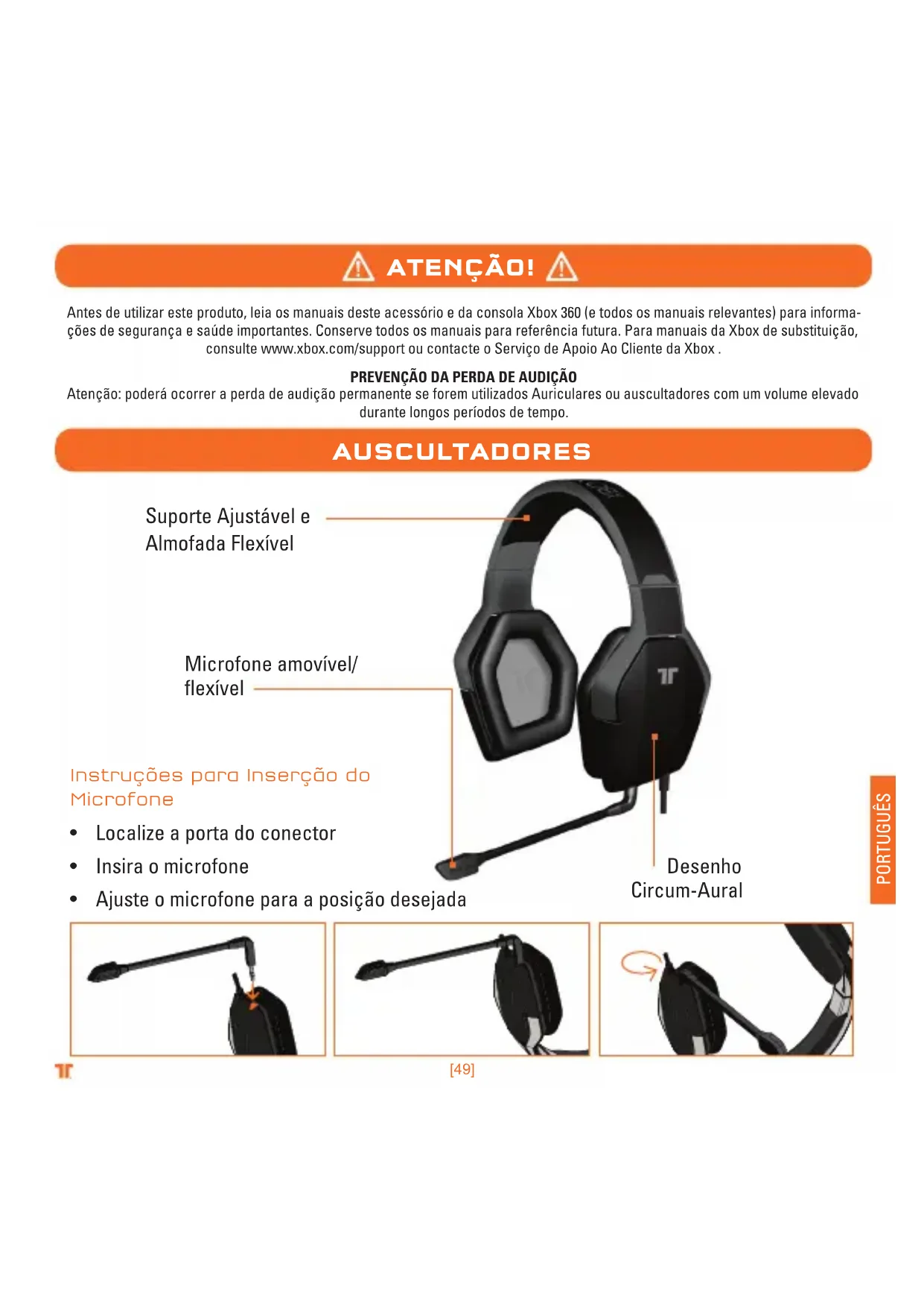 - Ajuste o microfone para a posição desejada Desenho Circum-Aural ATENÇÃO! AUSCULTADORES Antes de utilizar este produto, leia os manuais deste acessório e da consola Xbox 360 (e todos os manuais relevantes) para informa- ções de segurança e saúde importantes. Conserve todos os manuais para referência futura. Para manuais da Xbox de substituição, consulte www.xbox.com/support ou contacte o Serviço de Apoio Ao Cliente da Xbox . PREVENÇÃO DA PERDA DE AUDIÇÃO Atenção: poderá ocorrer a perda de audição permanente se forem utilizados Auriculares ou auscultadores com um volume elevado durante longos períodos de tempo.[50]