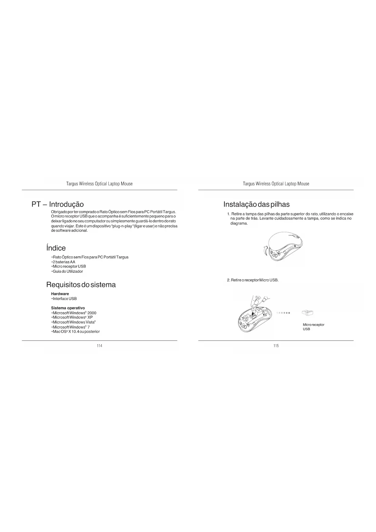 PT – Introdução Obrigado por ter comprado o Rato Óptico sem Fios para PC Portátil Targus. O micro receptor USB que o acompanha é sucientemente pequeno para o deixar ligado no seu computador ou simplesmente guardá-lo dentro do rato quando viajar. Este é um dispositivo “plug-n-play “(ligar e usar) e não precisa de software adicional. Requisitos do sistema Hardware