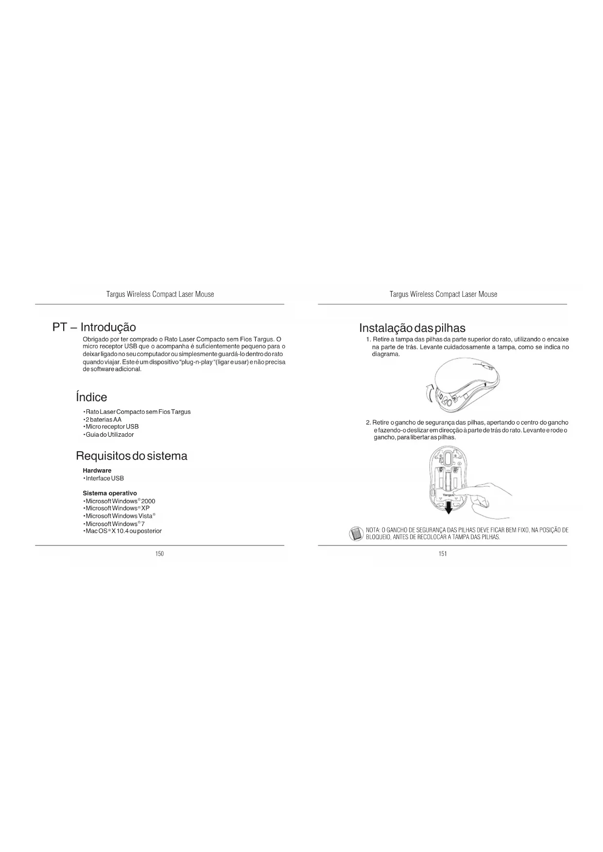 e fazendo-o deslizar em direcção à parte de trás do rato. Levante e rode o gancho, para libertar as pilhas. NOTA: O GANCHO DE SEGURANÇA DAS PILHAS DEVE FICAR BEM FIXO, NA POSIÇÃO DE BLOQUEIO, ANTES DE RECOLOCAR A TAMPA DAS PILHAS.Targus Wireless Compact Laser Mouse