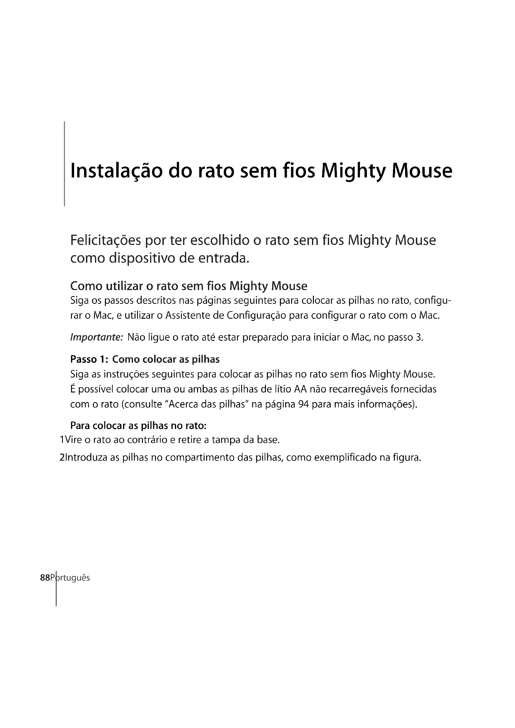 Â868788 Português 11 InstalaçãodoratosemfiosMightyMouse FelicitaçõesporterescolhidooratosemfiosMightyMouse comodispositivodeentrada. ComoutilizaroratosemfiosMightyMouse Siga os passos descritos nas páginas seguintes para colocar as pilhas no rato, configu- rar o Mac, e utilizar o Assistente de Configuração para configurar o rato com o Mac. Importante:Não ligue o rato até estar preparado para iniciar o Mac, no passo 3. Passo1:Comocolocaraspilhas Siga as instruções seguintes para colocar as pilhas no rato sem fios Mighty Mouse. É possível colocar uma ou ambas as pilhas de lítio AA não recarregáveis fornecidas com o rato (consulte “Acerca das pilhas” na página 94 para mais informações). Paracolocaraspilhasnorato: 1 Vire o rato ao contrário e retire a tampa da base. 2 Introduza as pilhas no compartimento das pilhas, como exemplificado na figura.Português 89 3 Volte a colocar a tampa e deixe o rato desligado. Passo2:ComoconfiguraroMac Siga as instruções no guia do utilizador fornecido com o Mac para o configurar. Uma vez que se trata de um rato sem fios, avance as instruções para ligar um rato via USB. Aguarde para iniciar o Mac, até ao momento indicado no passo 3. Deslize o interruptor para cima para desligar o mouse. Empurre a presilha para remover a tampa inferior. Insira uma ou ambas baterias AA com a extremidade positiva (+) para cima.90 Português Passo3:Comoemparelharorato Antes de poder utilizar o rato sem fios Mighty Mouse, é necessário proceder ao seu emparelhamento com o Mac. O emparelhamento permite a comunicação sem fios do rato com o Mac. Só é necessário emparelhá-los uma vez. Da primeira vez que iniciar o seu Mac, o Assistente de Configuração irá orientá-lo ao longo da configuração do rato sem fios Mighty Mouse e do emparelhamento com o Mac. ParaemparelharoratocomoMac: 1 Deslize o interruptor para baixo para ligar o rato. O laser utilizado pelo rato Mighty Mouse não é visível; um indicador luminoso verde na base do rato pisca quando o rato está ligado e as pilhas estão carregadas. 2 Ligue o Mac. 3 Quando o Mac arrancar, siga as instruções no ecrã do Assistente de Configuração. Deslize o interruptor para