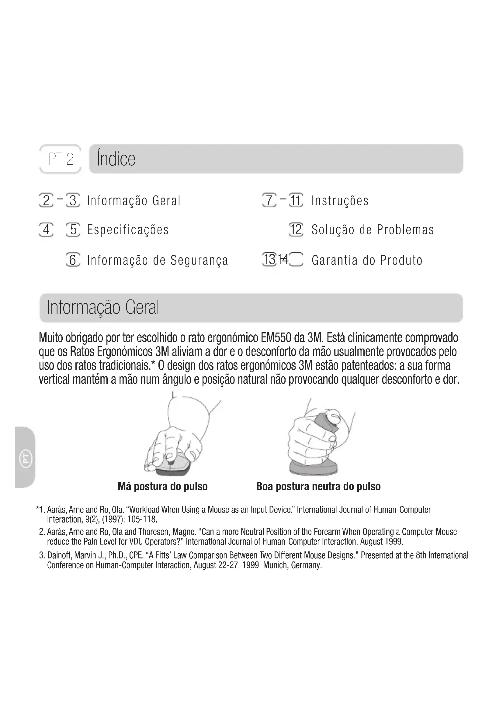 PT- 2Informação Geral Utilizando um rato tradicional, toda a área do pulso é demasiado pressionada contra à superfície de trabalho, causando dor e desconforto no antebraço e no próprio pulso. Este movimento e esforço repetidos podem conduzir a diversas lesões e dores na mão, pulso e braço. O rato ergonómico 3M